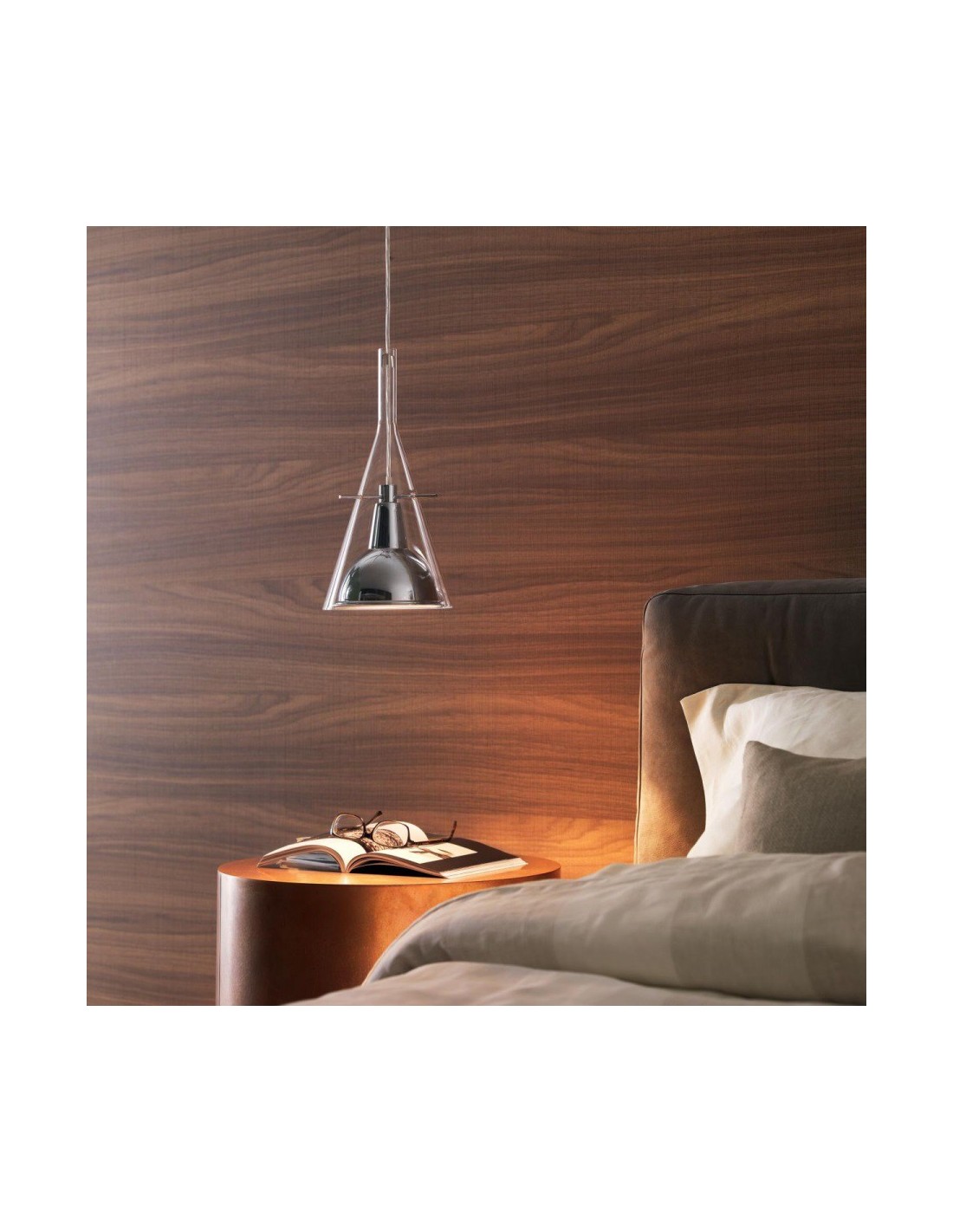 La lampada Flute Fontana Arte è disponibile nella versione a sospensione, a terra e da parete, è dotata di un paralume di forma conica realizzato in vetro borosilicato trasparente al cui interno presenta un riflettore in alluminio cromato sorretto da tre bracci.