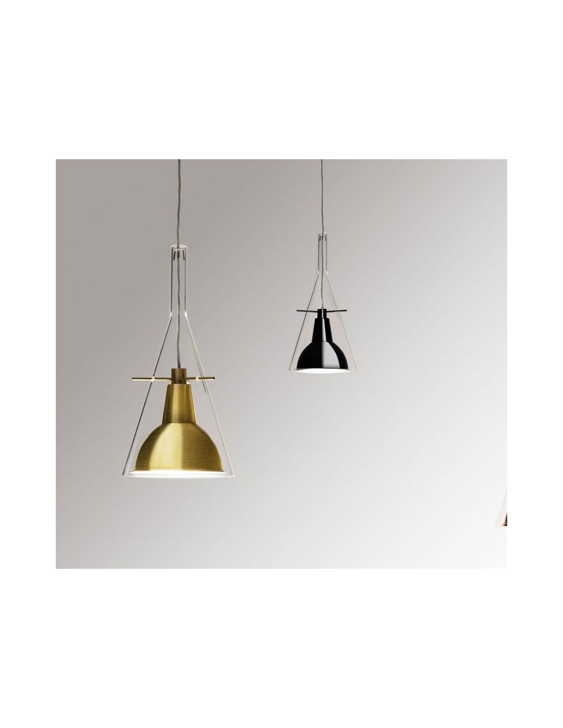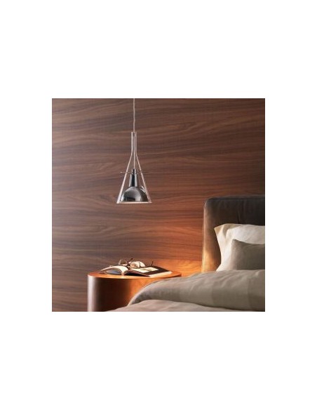 La lampada Flute Fontana Arte è disponibile nella versione a sospensione, a terra e da parete, è dotata di un paralume di forma conica realizzato in vetro borosilicato trasparente al cui interno presenta un riflettore in alluminio cromato sorretto da tre bracci.