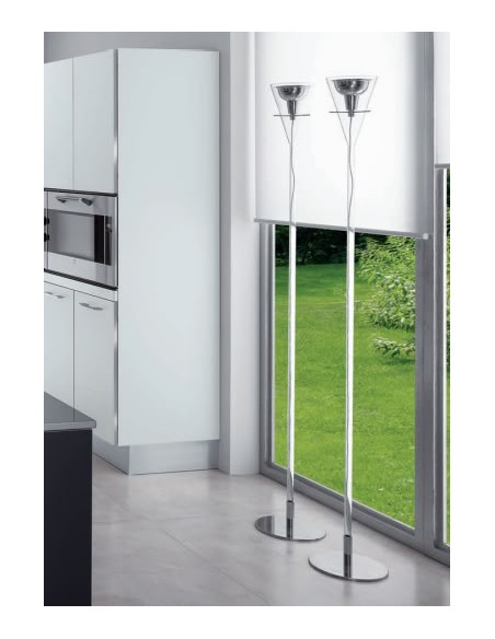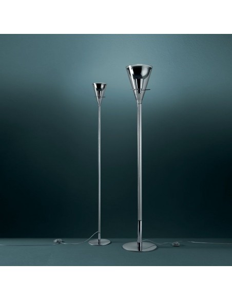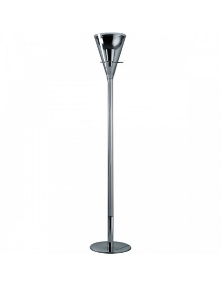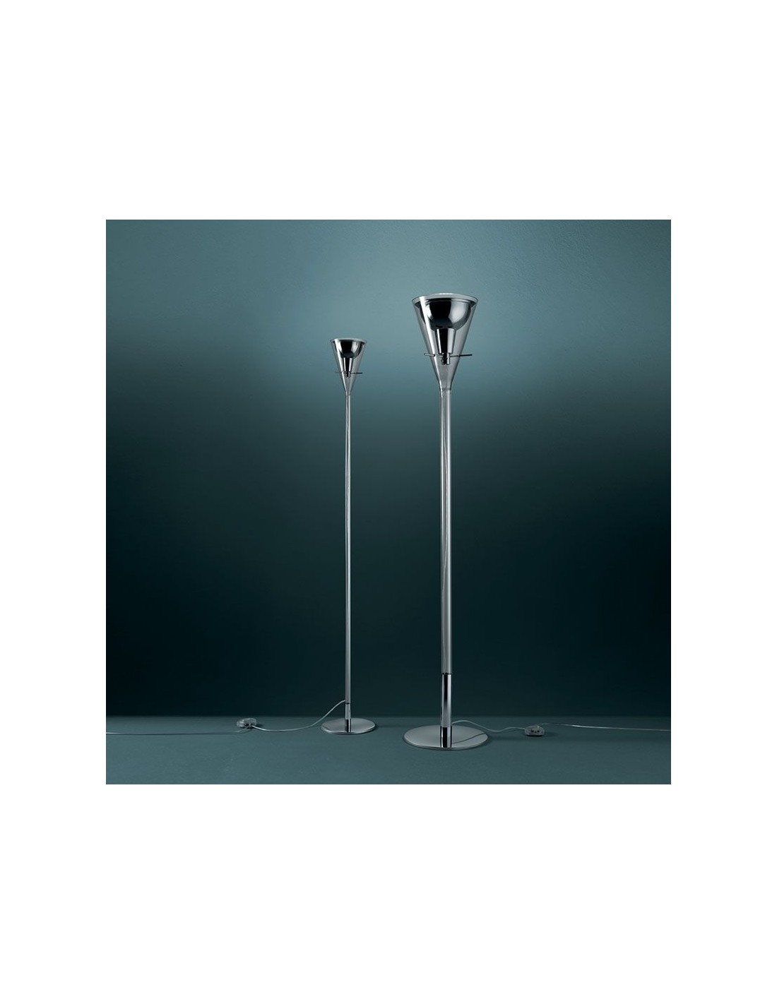 La lampada Flute Fontana Arte è disponibile nella versione a sospensione, a terra e da parete, è dotata di un paralume di forma conica realizzato in vetro borosilicato trasparente al cui interno presenta un riflettore in alluminio cromato sorretto da tre bracci.