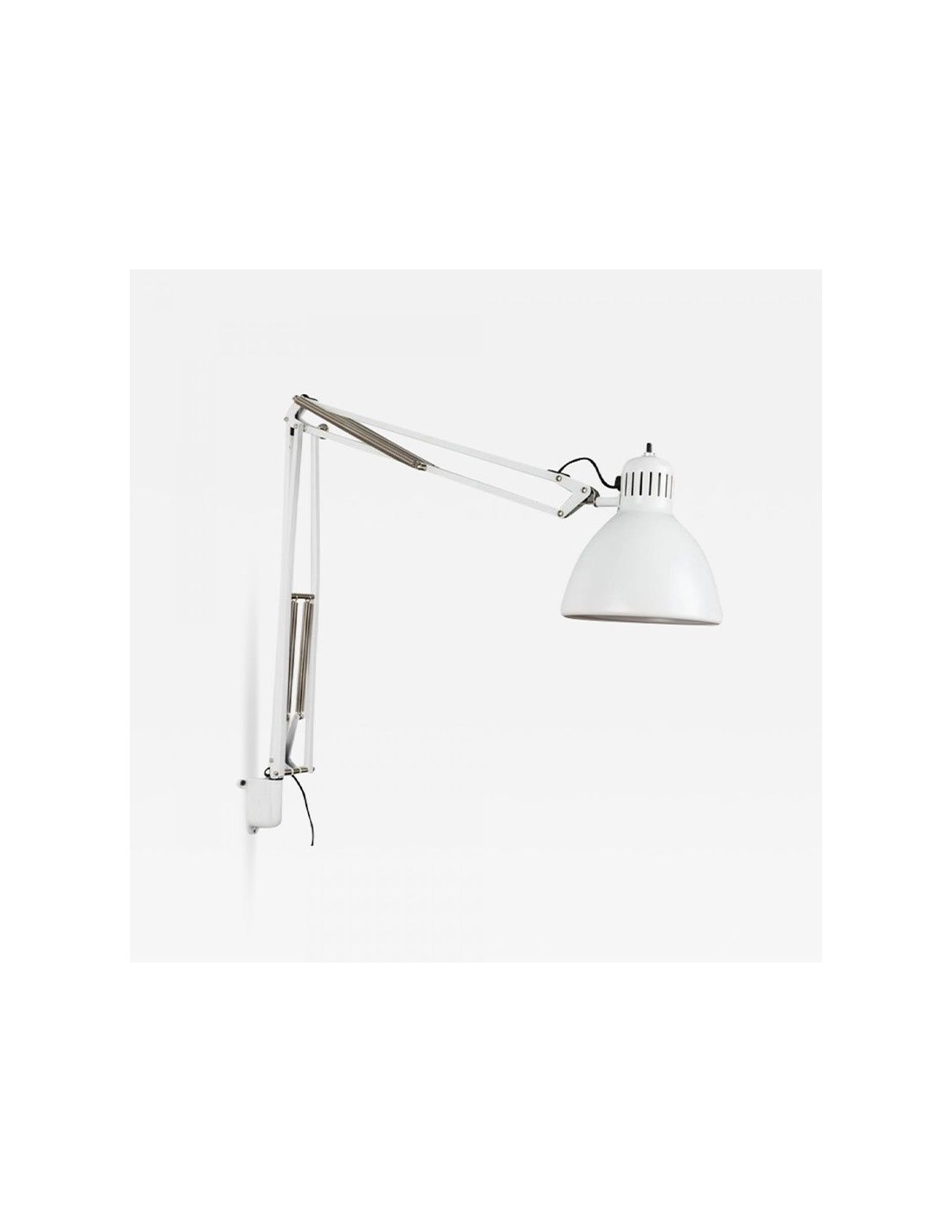 Lampada da parete a luce diretta non dimmerabile. Supporto parete e corpo orientabile in metallo cromato. Accensione tramite interruttore a rotazione posto sulla testa del diffusore. Cavo e spina neri. Spina europea due poli. Fonte luminosa non inclusa. a