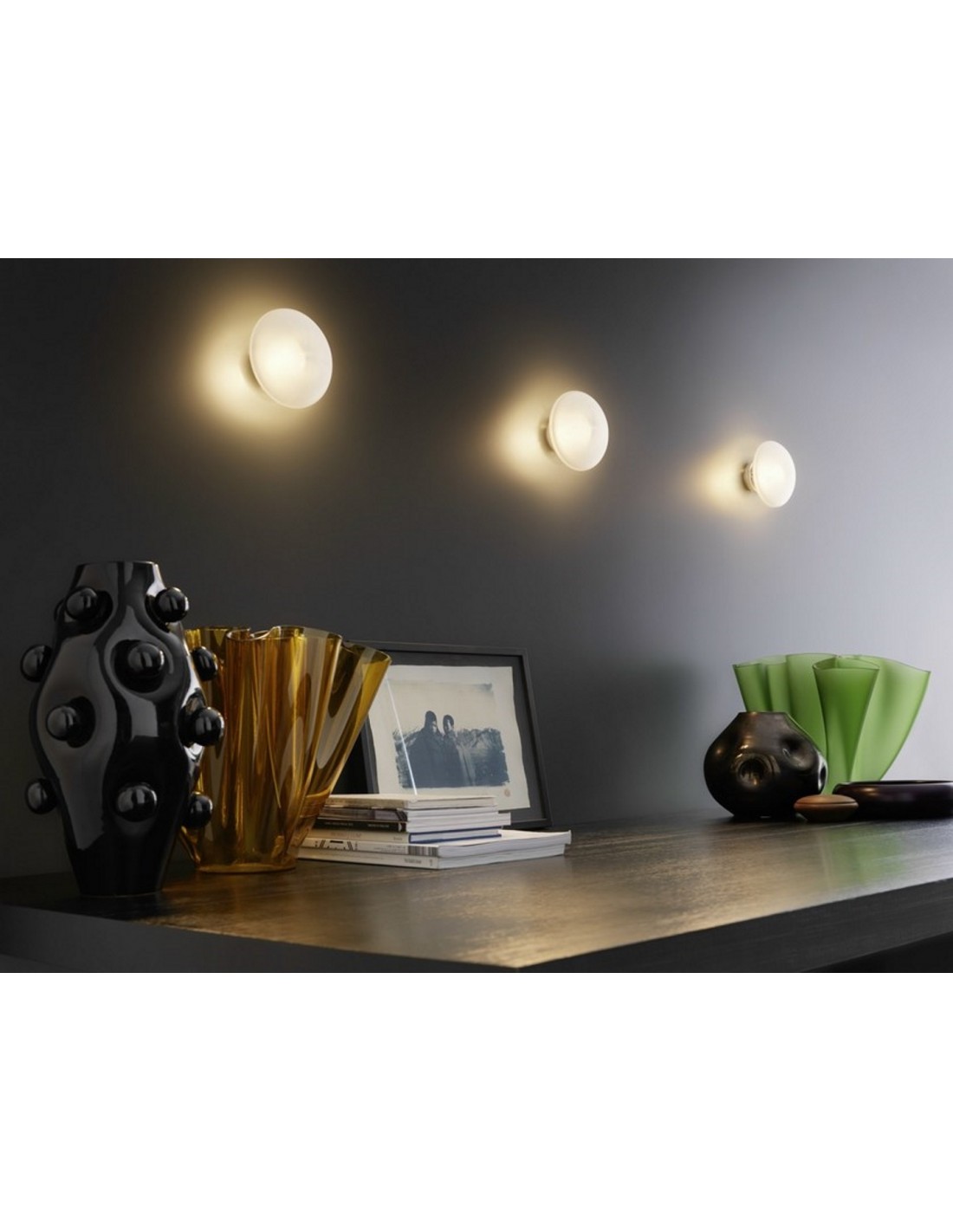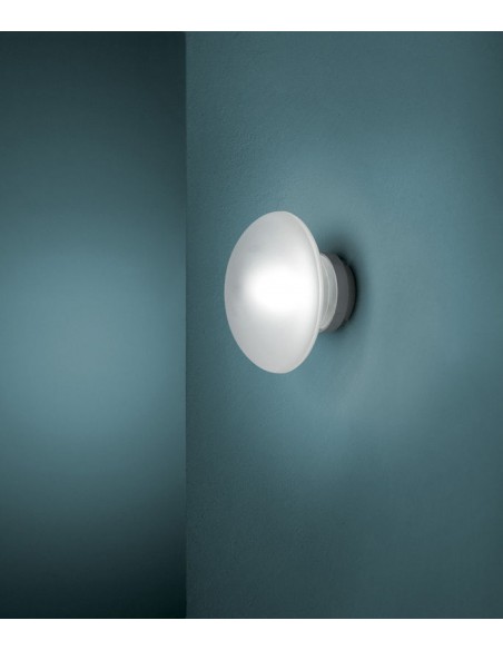 Lampada da parete/plafone a luce diffusa dimmerabile. Montatura in materiale termoplastico. Diffusore in vetro borosilicato stampato sabbiato esternamente. Trasformatore e fonte luminosa non inclusi.