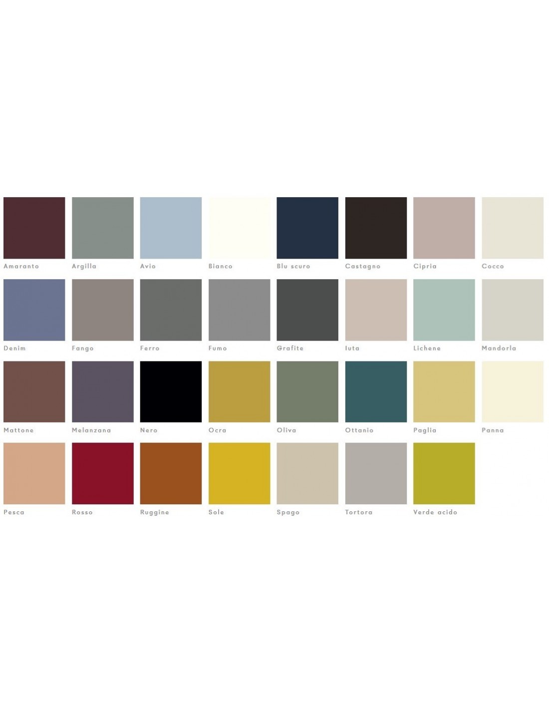 - Campionari colori: Bianco, panna, fango, avio, fumo, sole, oliva, grafite, argilla, spago, ocra, cipria, melanzana, paglia, verde acido, blu scuro, amaranto, mattone, castagno, ferro, mandorla, cocco, rosso, tortora, iuta, cielo, pesca, lichene, ottanio, ruggine, denim, nero.