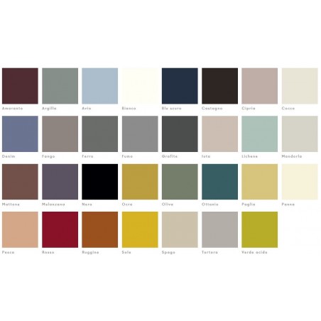 - Campionario colori: Bianco, panna, fango, avio, fumo, sole, oliva, grafite, argilla, spago, ocra, cipria, melanzana, paglia, verde acido, blu scuro, amaranto, mattone, castagno, ferro, mandorla, cocco, rosso, tortora, iuta, cielo, pesca, lichene, ottanio, ruggine, denim, nero.