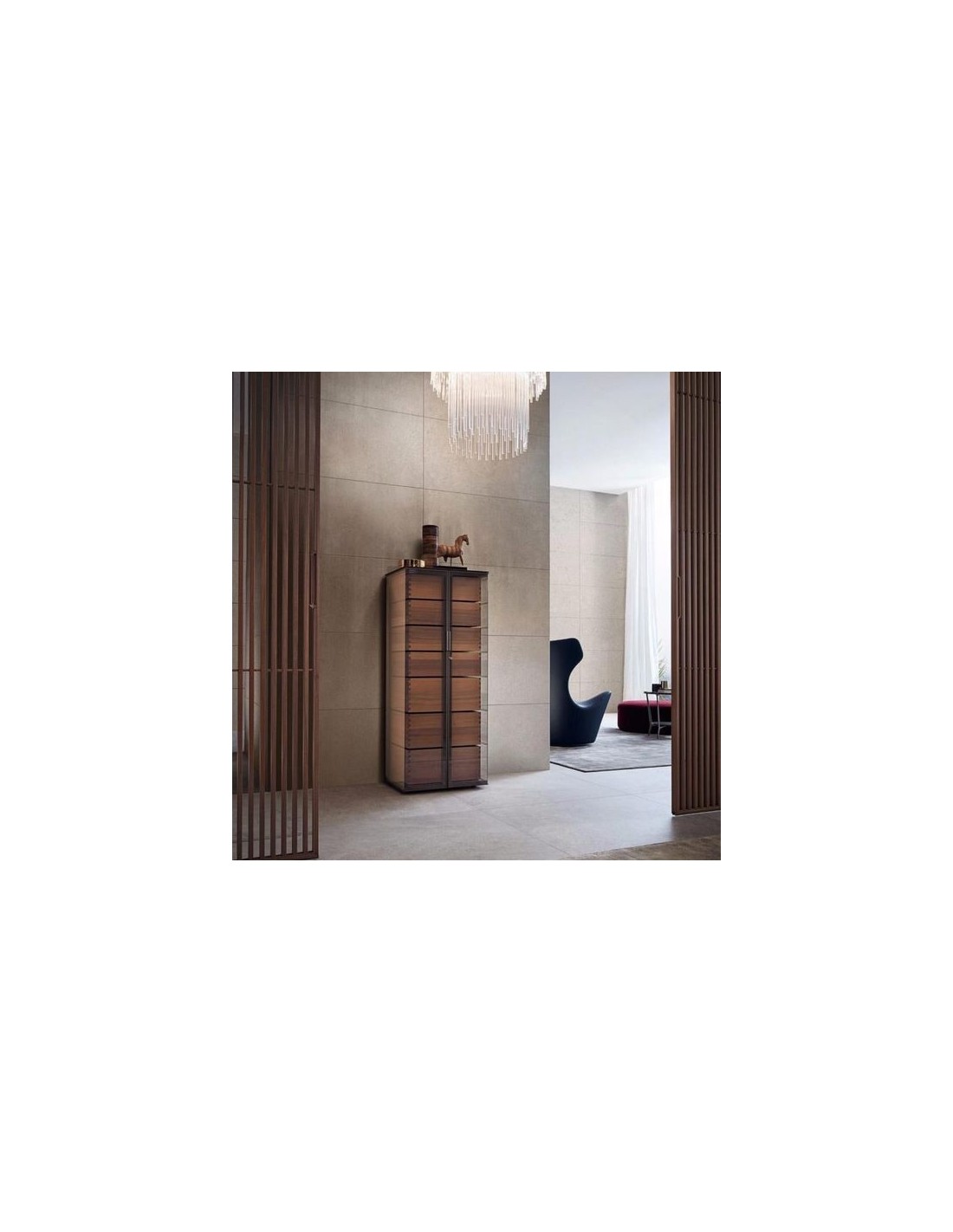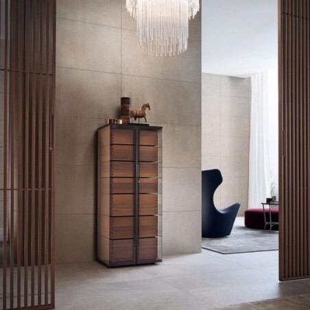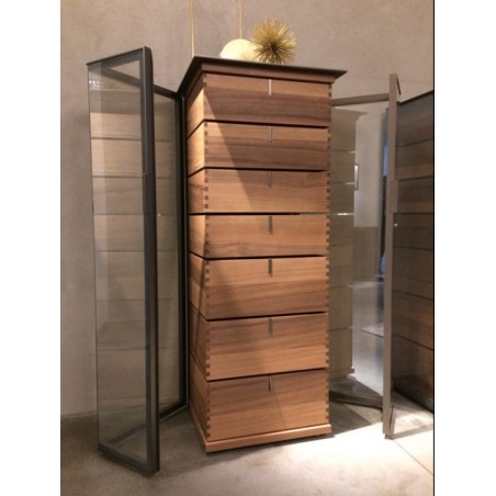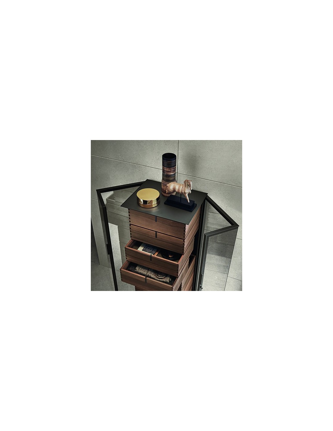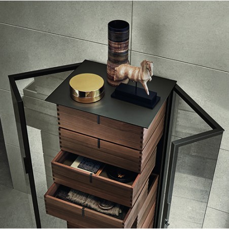 I contenitori Ala di Rimadesio sono la dimostrazione di come in alcuni casi gli arredi vadano oltre i limiti funzionali per assumere un ruolo diverso: diventano, così, delle soluzioni innovative grazie a cui lo spazio può essere caratterizzato in maniera unica, e possono essere utilizzati per accogliere gli oggetti di maggior valore. Ala si presenta come una vetrina, ma per molti aspetti è un vero e proprio scrigno di alta qualità. I cassetti in essenza di noce, per esempio, mostrano la tipica costruzione a coda di rondine, e sono progettati in modo da essere sospesi su una struttura nascosta interna.