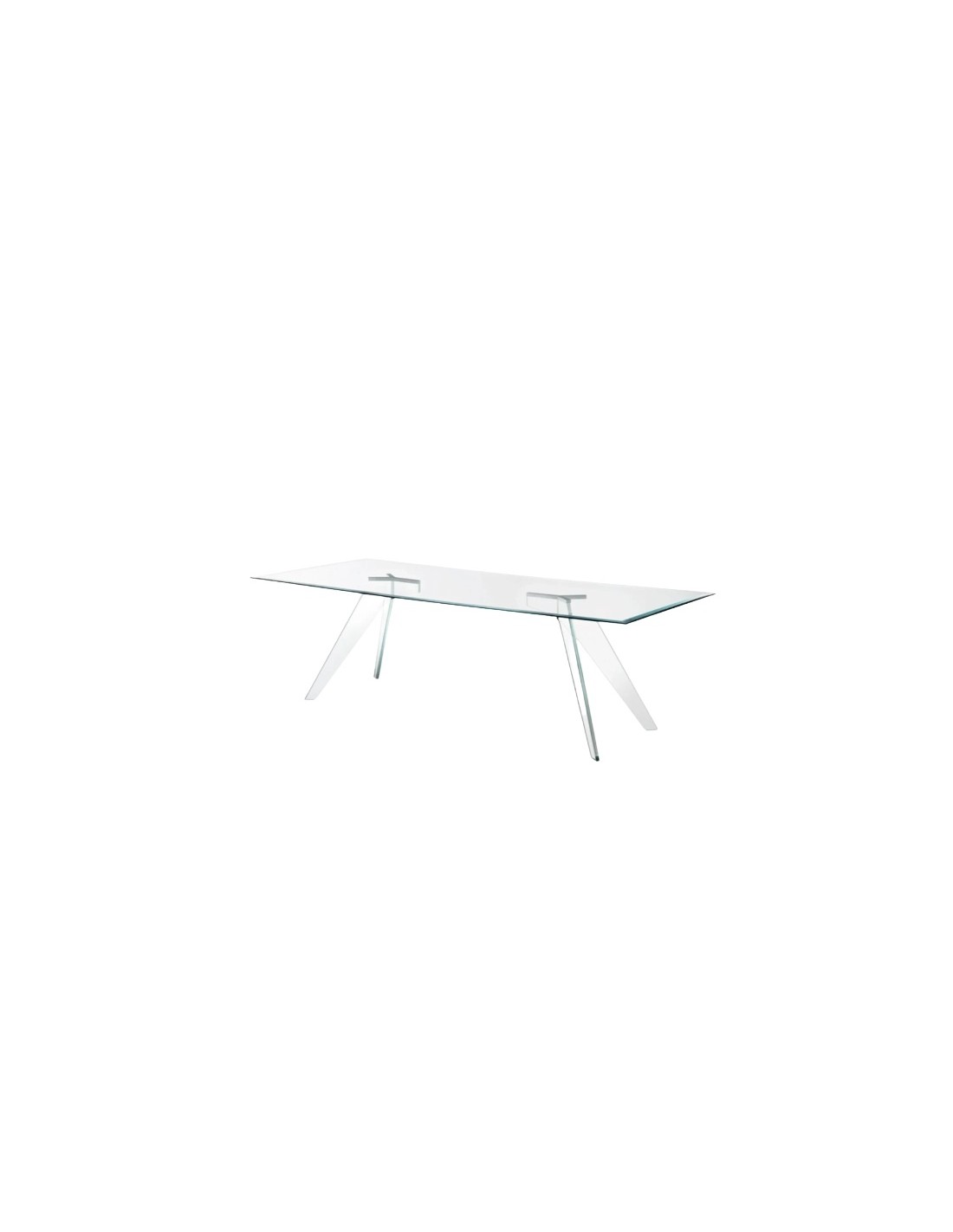 Tavolo da pranzo rettangolare con piano e basamento in cristallo temperato caratterizzato da linee pulite ed essenziali.