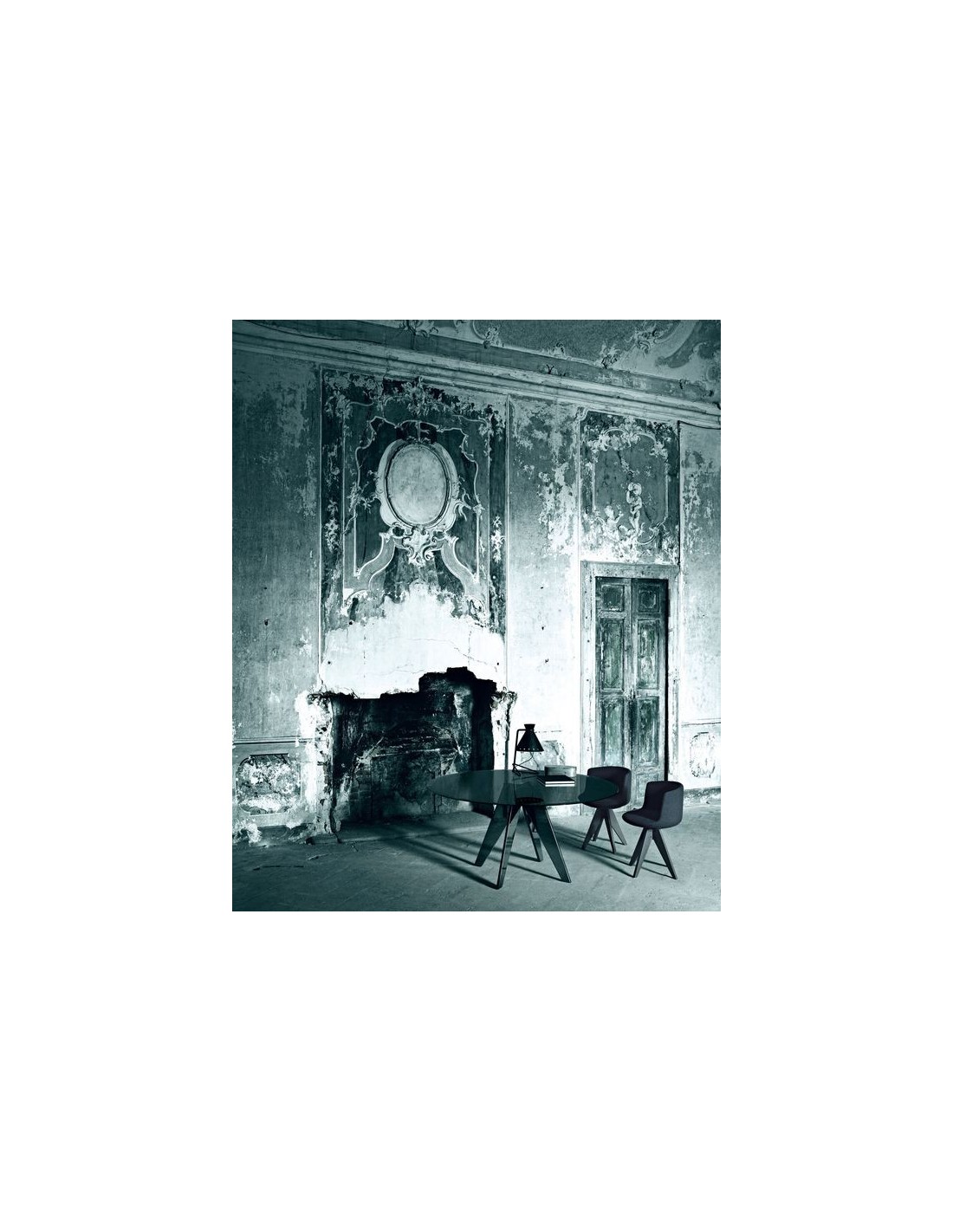 La base, anche questa in cristallo trasparente extralight o fumè stratificato 19 mm è ottenuta attraverso delle complesse lavorazioni di molatura, bisellatura ed incollaggio. E' smontabile ed è fissata al piano tramite delle piastre sagomate in acciaio inox.