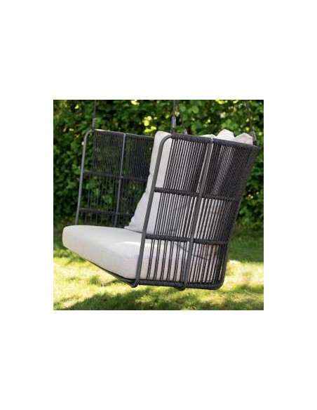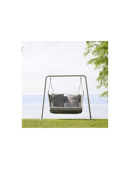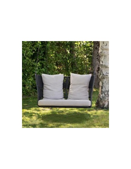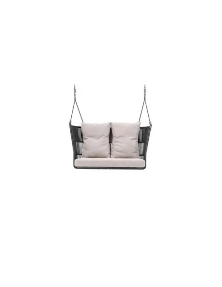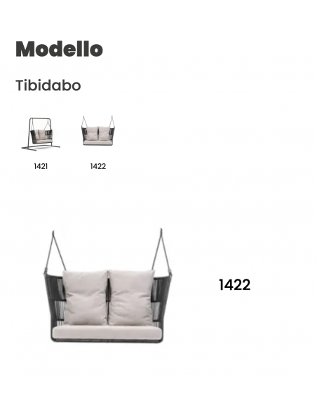 L’Altalena Tibidabo è un vero pezzo di design outdoor che invita al riposo. Realizzata con struttura portante in alluminio verniciato a polveri, è corredata da seduta a due posti strutturata con corda sintetica intrecciata a mano. La versione sospesa, dotata di un set di corde da 4 metri, è ideale per essere appesa a un trave, ramo o struttura dedicata, mentre la versione con base a terra offre più stabilità. I cuscini imbottiti in Dryfeel® garantiscono comfort e resistenza all’esterno.