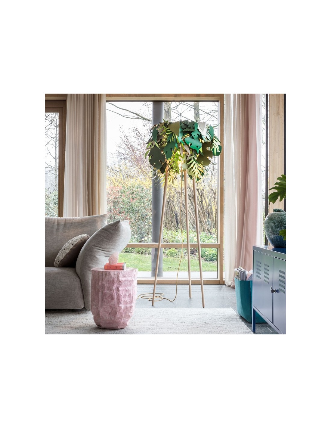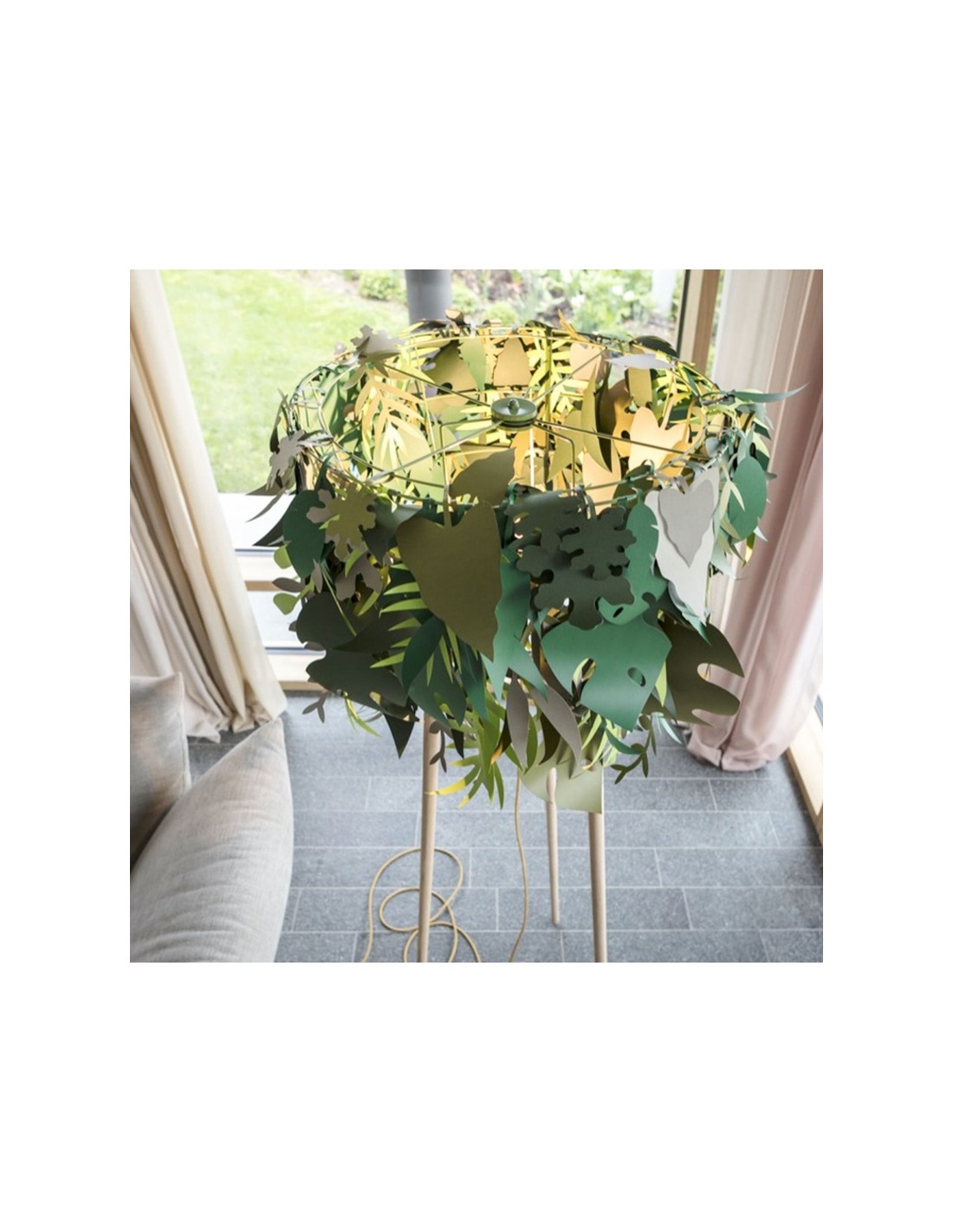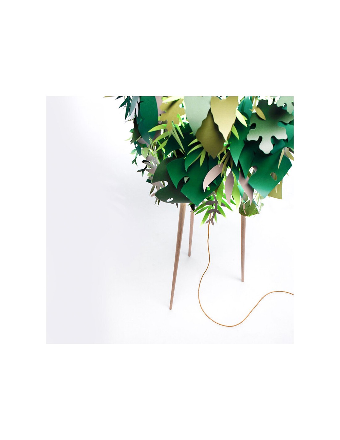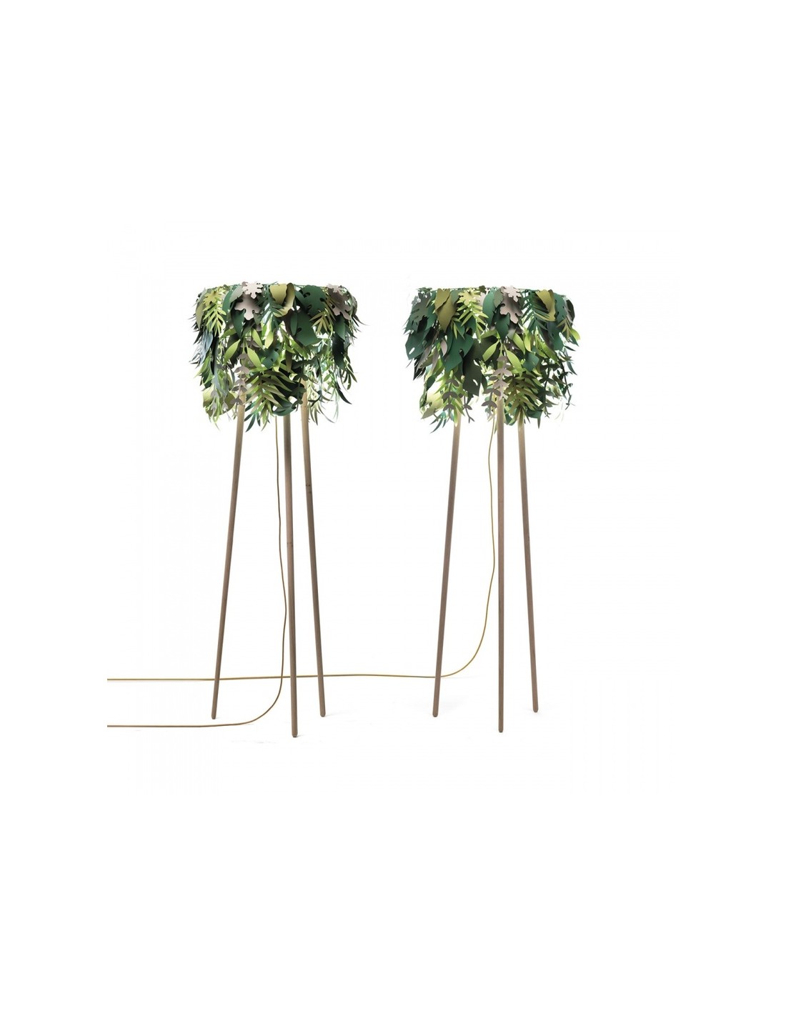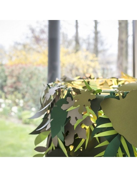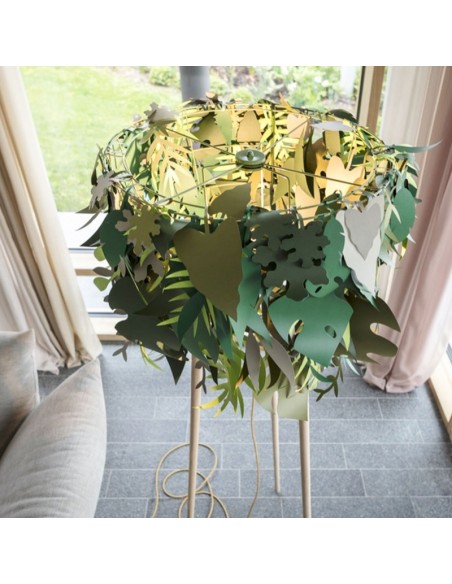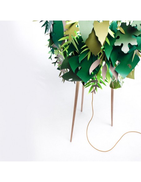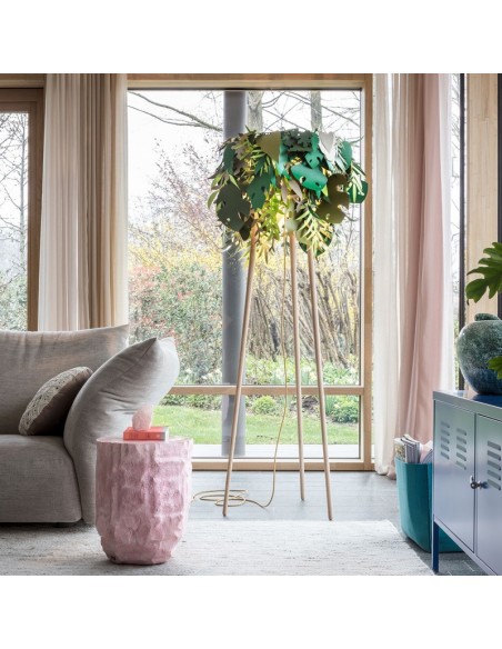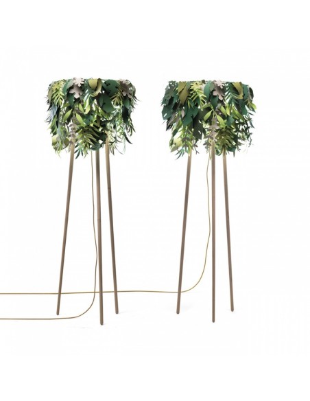 La lampada Amazzonio è una lampada da terra con steli in legno di frassino che trasferisce la natura nel tuo ambiente domestico attraverso l'utilizzo di foglie in carta plastificata nelle diverse sfumature del verde. E’ una lampada che fa sognare.
