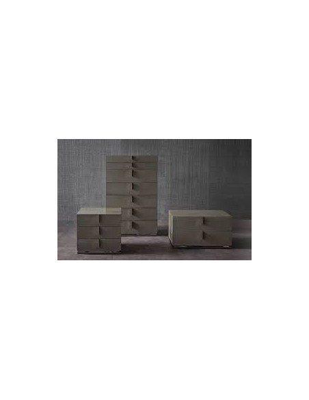 Elementi contenitori per la zona notte, costituiti da comodino a due o tre cassetti e settimanale a sette cassetti. Il primo e secondo cassetto del settimanale si completano con divisori interni portagioie rivestiti in tessuto. Struttura laccata eff etto galuchat disponibili nei colori: Laguna opaco N083 - Deserto opaco N082. Cassetti dotati di ritorno, interno in multistrato di betulla, tinto nero. Maniglie e base nickel nero lucido.