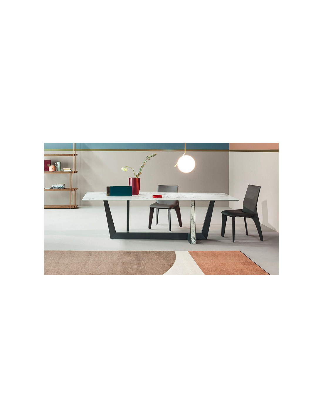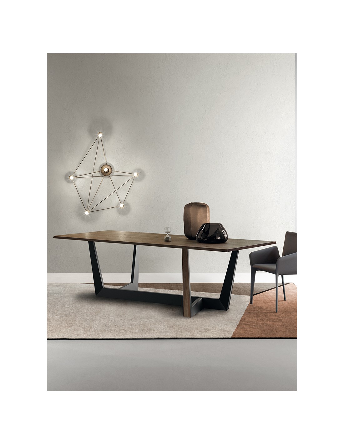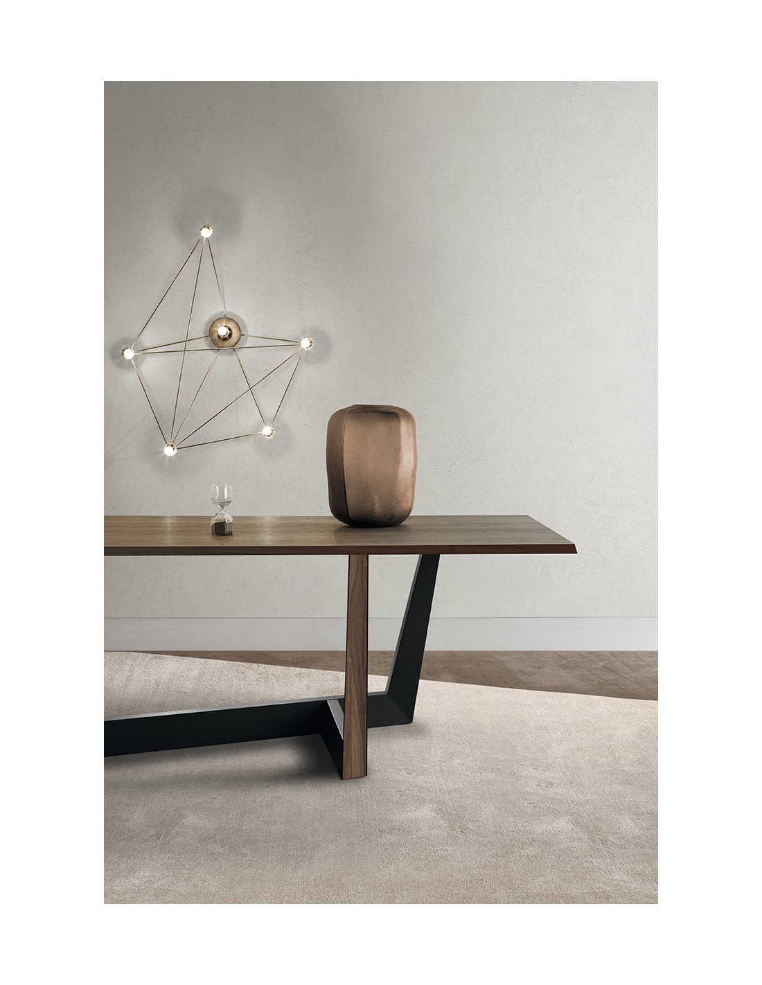 Il tavolo Art è espressione di un'intuizione progettuale lucida e razionale, come la geometria a cui il designer Gino Carollo si è ispirato. La base è l'elemento che lo caratterizza maggiormente: costituita da un trapezio in metallo che si sviluppa diagonalmente rispetto al piano, ottimizza l'ingombro a favore di uno spazio di utilizzo maggiore. Si contraddistingue inoltre, per l’elevato dinamismo, la solidità e l’impatto scultoreo. Il piano vi si poggia saldamente, ma l’effetto finale è di grande leggerezza. La base di Art è realizzata in metallo verniciato ed è disponibile in numerosi varianti cromatiche, inoltre può essere personalizzata con inserti nella stessa finitura del piano, per garantire ulteriore coerenza. Il piano (rettangolare in questa versione) è disponibile anche rotondo, a botte oppure allungabile. È proposto in diversi materiali: ceramica, cristallo o legno.