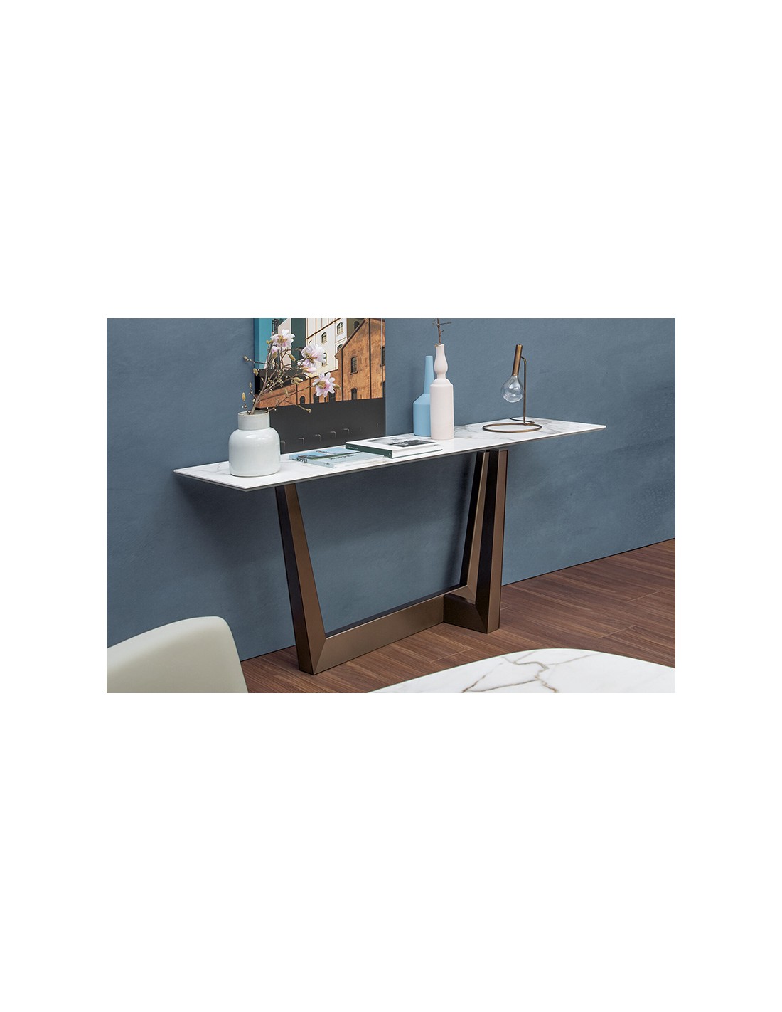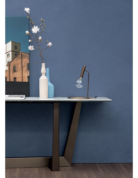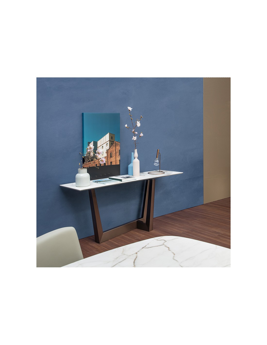 In Art console, un trapezio in metallo si sviluppa diagonalmente rispetto al piano, ottimizzando l'ingombro a favore di uno spazio di utilizzo maggiore. A garantire la stabilità, si uniscono al trapezio due gambe che possono essere personalizzate con inserti nella stessa finitura del piano. La struttura portante così progettata si contraddistingue per l’elevato dinamismo, la solidità e l’impatto scultoreo. Il piano vi si poggia saldamente con un effetto finale di grande leggerezza. La base è disponibile in metallo verniciato opaco o nelle eleganti finiture brunito o bronzo-rame; il piano è realizzato in diverse essenze di legno oppure in ceramica. Abbinabile all'omonimo tavolo, Art si contraddistingue per la propria raffinata valenza geometrica e grafica, esaltata dalla ricchezza dei materiali e delle finiture.