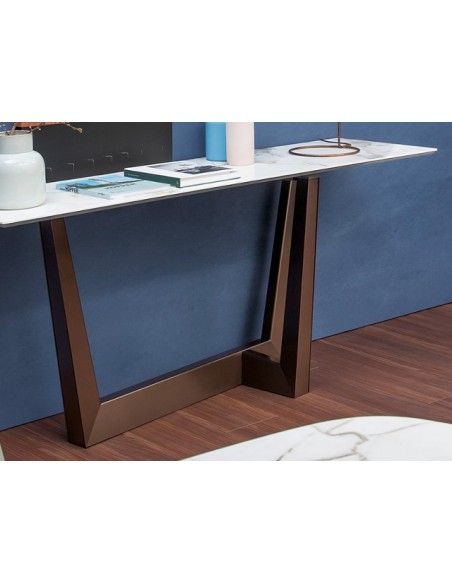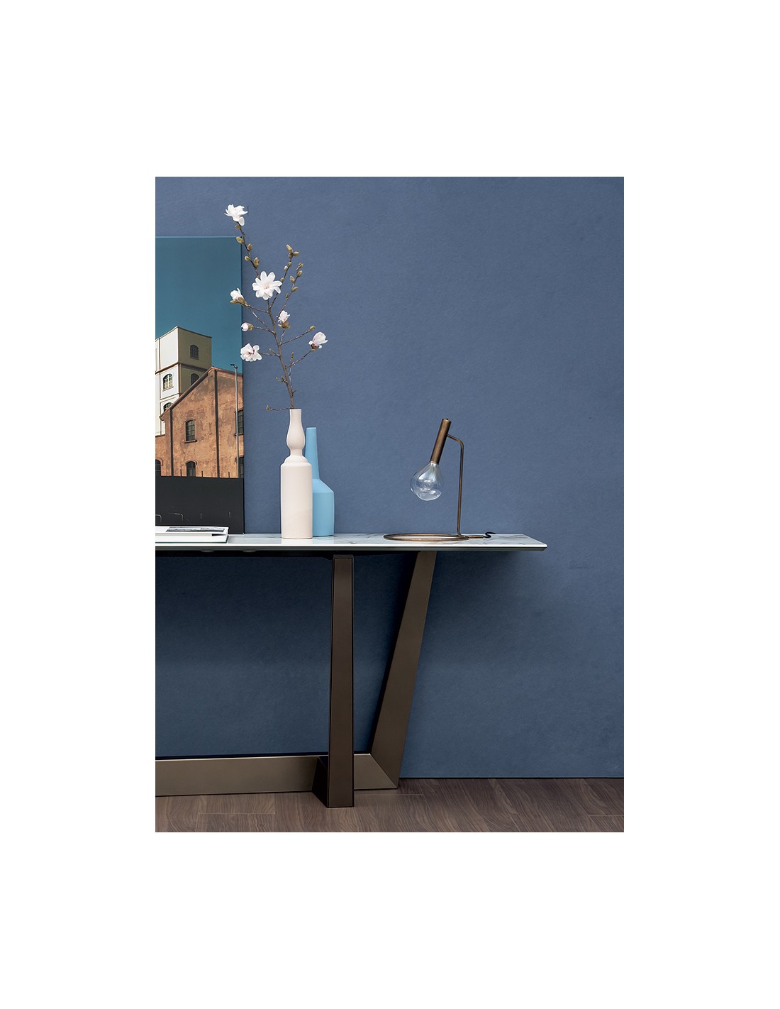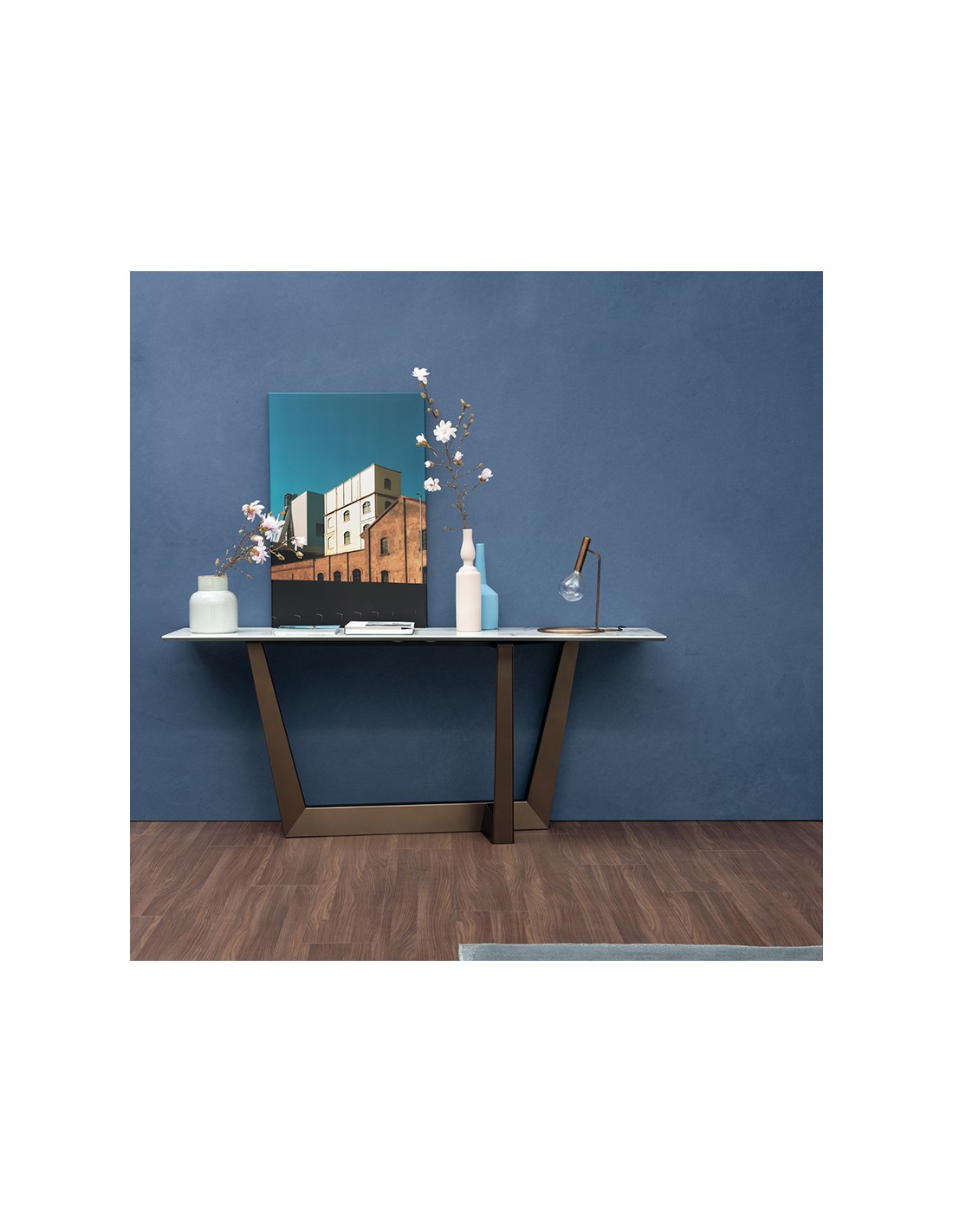In Art console, un trapezio in metallo si sviluppa diagonalmente rispetto al piano, ottimizzando l'ingombro a favore di uno spazio di utilizzo maggiore. A garantire la stabilità, si uniscono al trapezio due gambe che possono essere personalizzate con inserti nella stessa finitura del piano. La struttura portante così progettata si contraddistingue per l’elevato dinamismo, la solidità e l’impatto scultoreo. Il piano vi si poggia saldamente con un effetto finale di grande leggerezza. La base è disponibile in metallo verniciato opaco o nelle eleganti finiture brunito o bronzo-rame; il piano è realizzato in diverse essenze di legno oppure in ceramica. Abbinabile all'omonimo tavolo, Art si contraddistingue per la propria raffinata valenza geometrica e grafica, esaltata dalla ricchezza dei materiali e delle finiture.