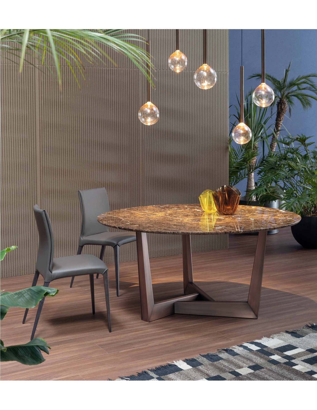 Il tavolo Art Wood è espressione di un'intuizione progettuale lucida e razionale, come la geometria a cui il designer Gino Carollo si è ispirato. La base è l'elemento che lo caratterizza maggiormente: costituita da un trapezio che si sviluppa diagonalmente rispetto al piano, ottimizza l'ingombro a favore di uno spazio di utilizzo maggiore. Si contraddistingue inoltre, per l’elevato dinamismo, la solidità e l’impatto scultoreo. Il piano vi si poggia saldamente, ma l’effetto finale è di grande leggerezza. La base di Art Wood è realizzata in legno massello nella finitura Noce Americano. Il piano (rotondo in questa versione) è disponibile anche a botte ed è proposto in due materiali: ceramica o cristallo.