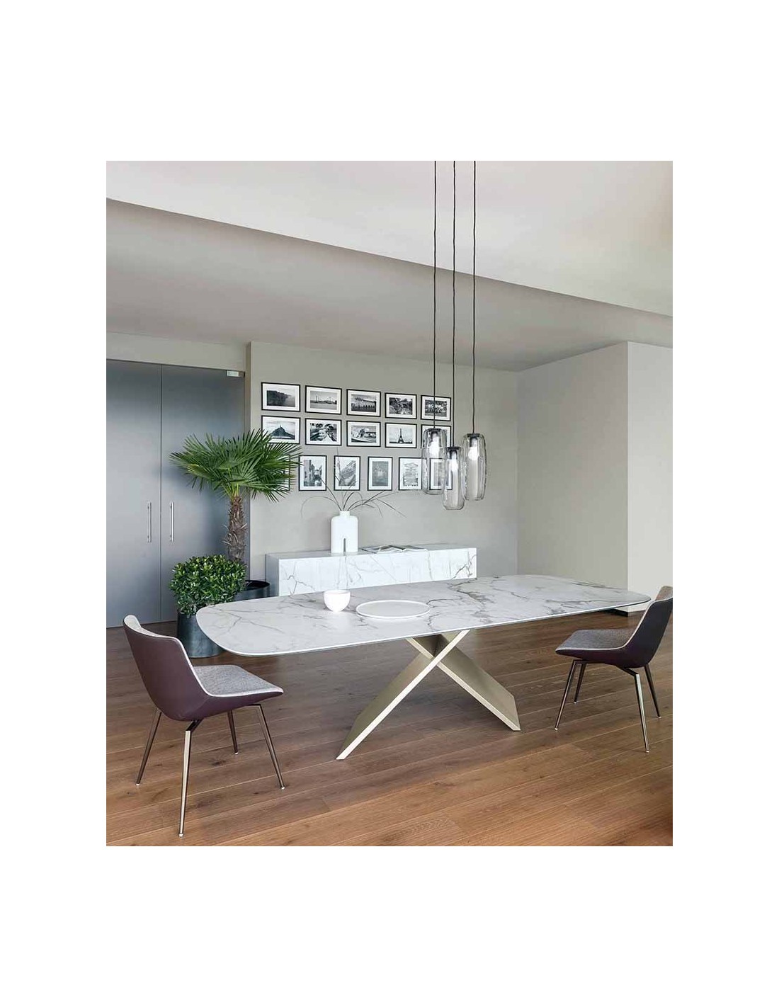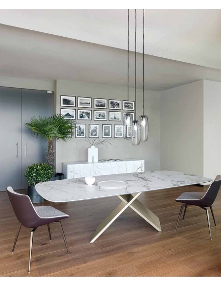 AX: un nome che esprime perfettamente le caratteristiche formali della base di questo tavolo, costituita da due elementi che si incrociano a X. Essenzialità geometrica e linearità sono scelte di un linguaggio progettuale per il tavolo AX improntato alla semplicità, ma connotato anche da una solida concretezza, sottolineata dall'importante basamento. Il fascino del contrasto materico tra piano e gambe rende superfluo qualsiasi decorativismo, esaltando la purezza del disegno e l’eccellenza artigianale di Bonaldo. A sottolineare il segno contemporaneo del progetto è la giustapposizione di materiali molto diversi tra loro: le gambe infatti sono proposte in metallo verniciato in numerose varianti cromatiche o con finitura brunito. Il piano, disponibile sia in versione fissa (rettangolare o a botte) che in quella allungabile, è realizzato in legno, cristallo o ceramica. Disponibile anche l'omonima console (AX Console), per creare ambienti dallo stile coordinato.