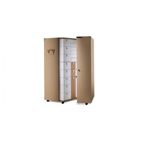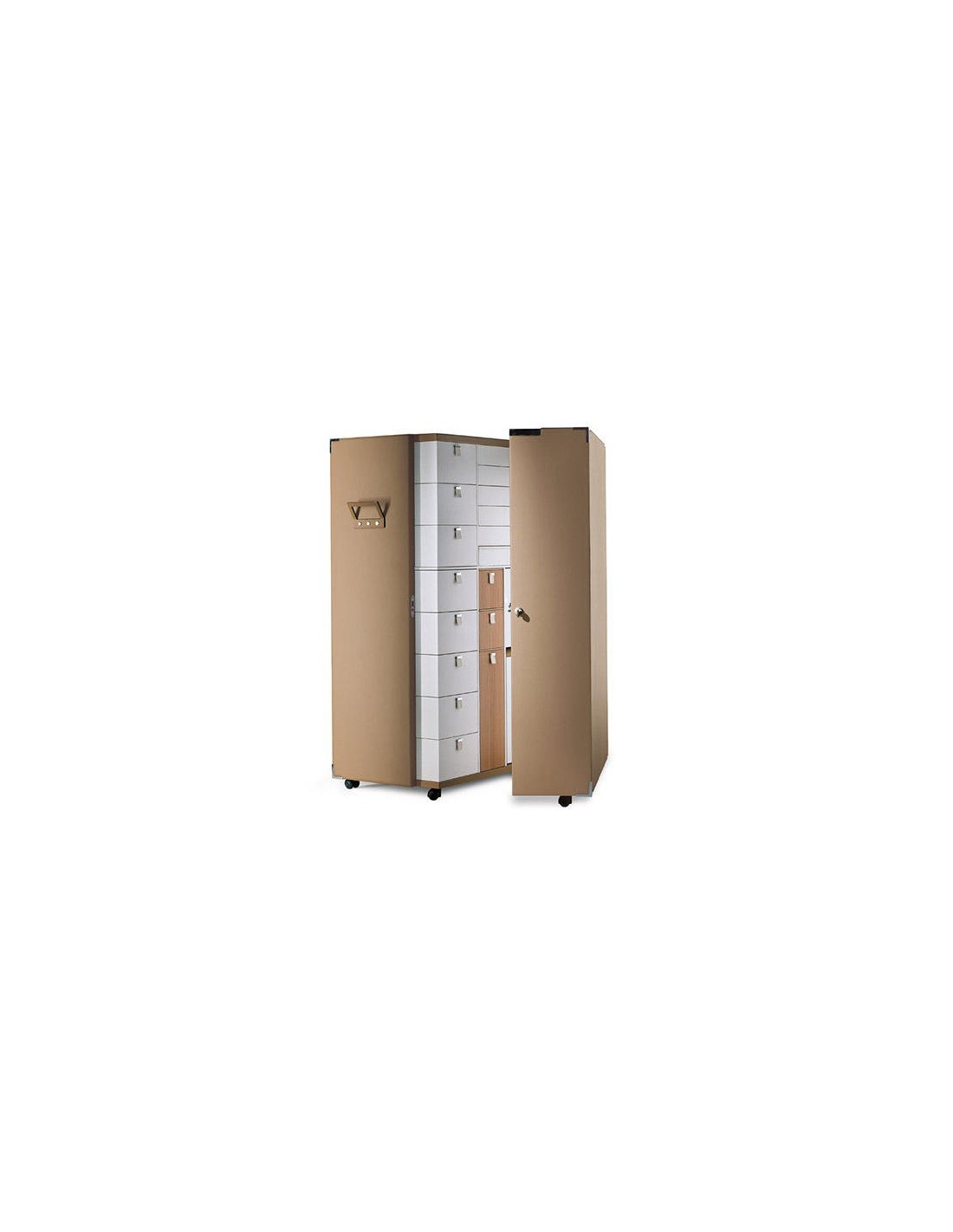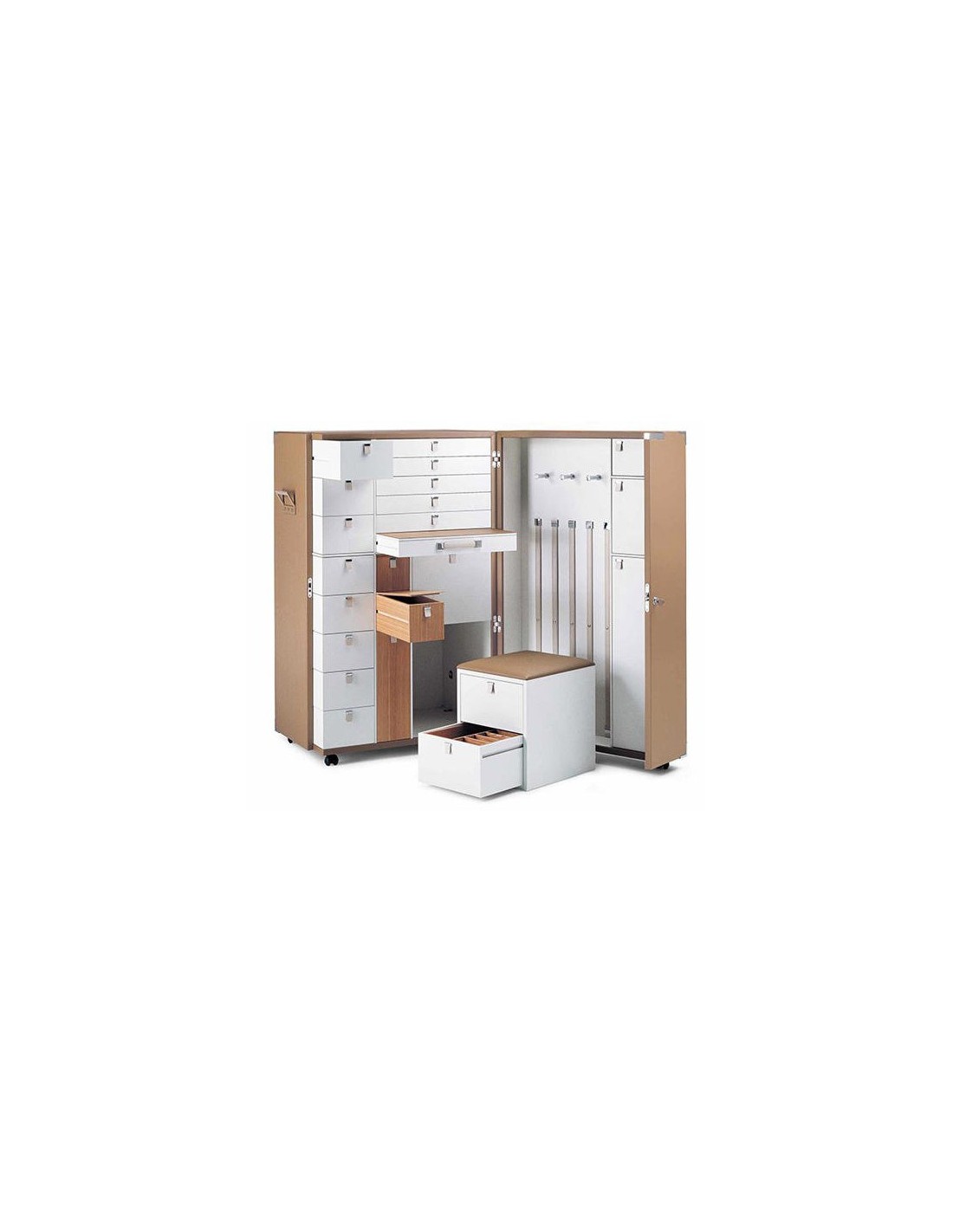 Baule da camera estremamente geometrico e dalle linee essenziali. Dotato al suo interno di vani contenitori, cassetti, scrittoio e pouf, è in grado di richiudersi perfettamente dopo l’utilizzo grazie al suo gioco millimetrico di incastri.