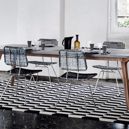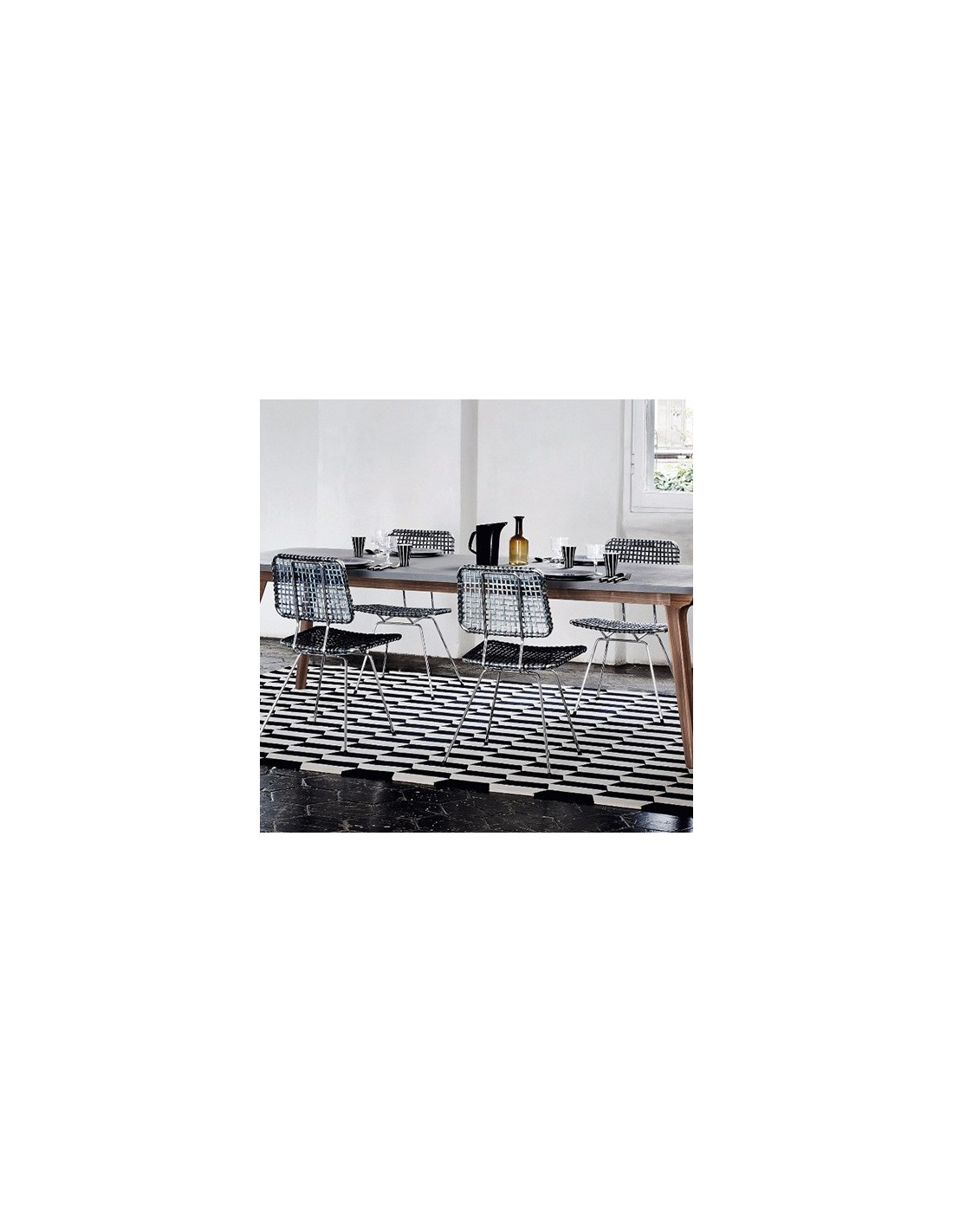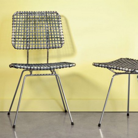 - Materiale: struttura in acciaio cromato con seduta e schienale intrecciato in pergamena grigia;