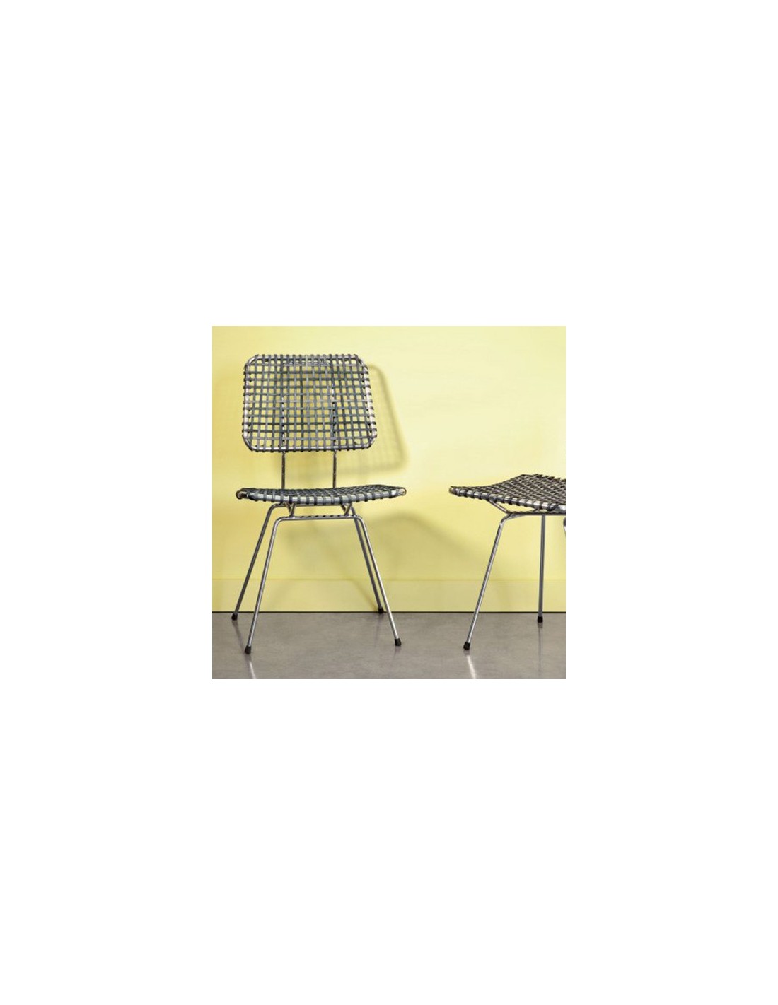 BRICK 23 è una sedia con struttura in tondino di acciaio cromato lucido, seduta e schienale in tubolare di acciaio intrecciati in pergamena grigia.