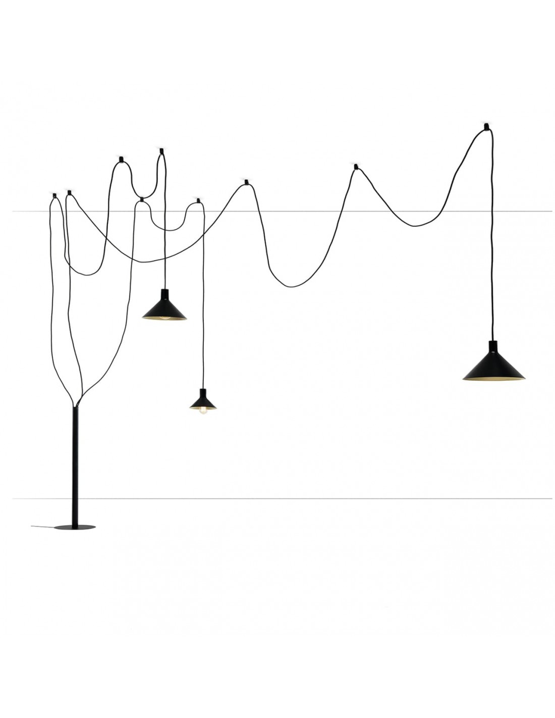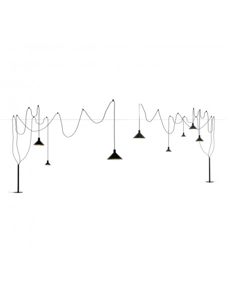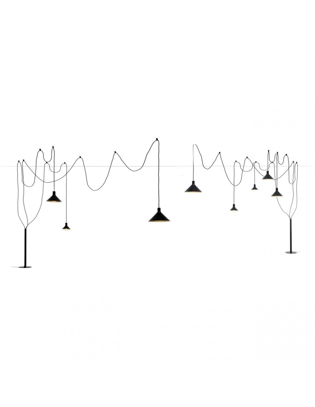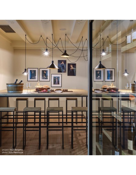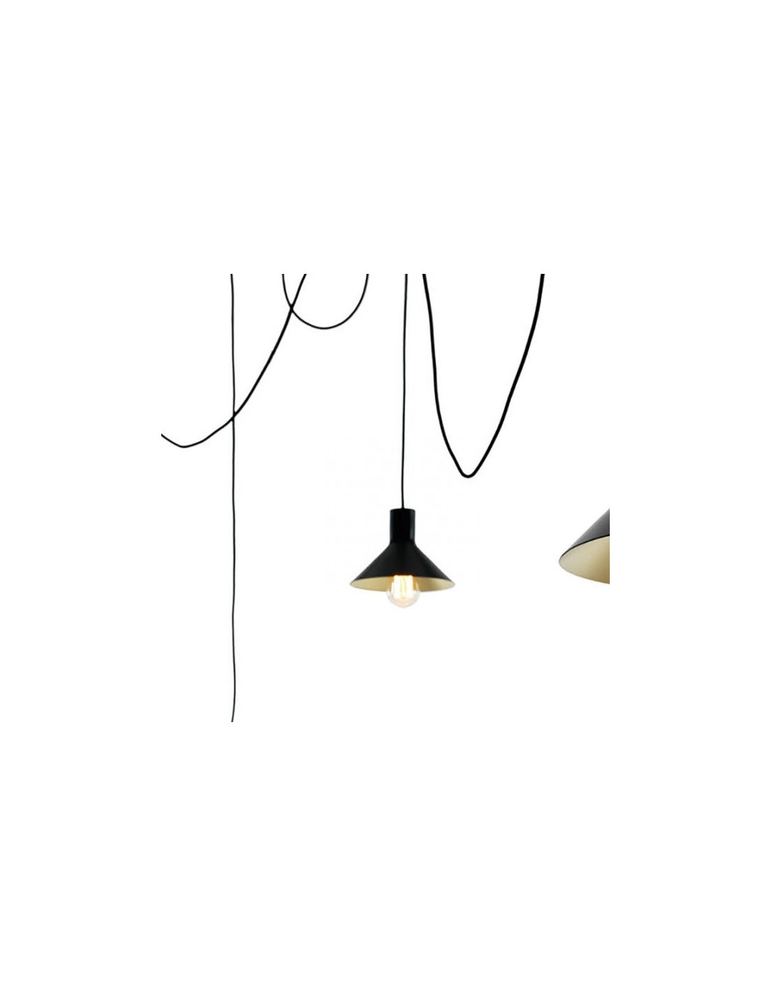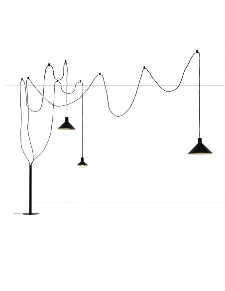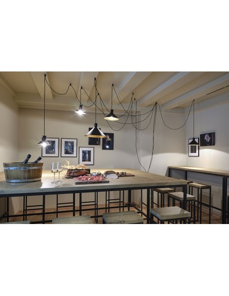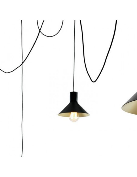 - Configurazione 5 paralumi: 3 cavi ( lungh. 4-4-6-8 mt. ) + 3 paralumi (diam 22cm, diam. 28cm, diam 35 cm) + 12 supporti a soffitto;