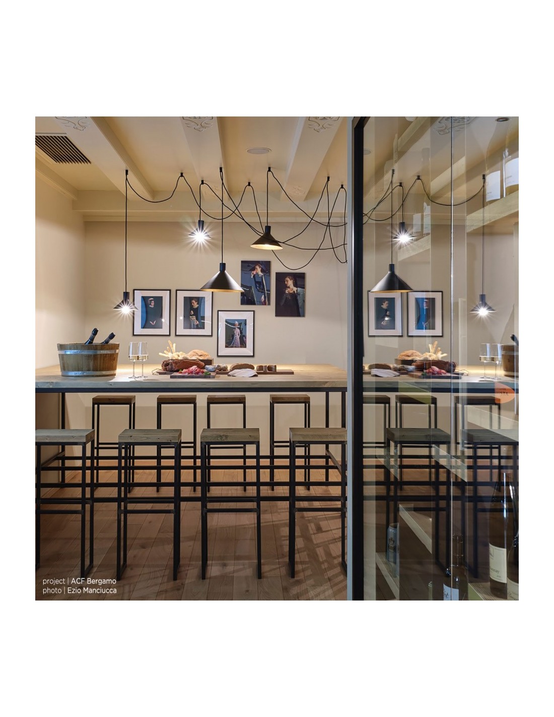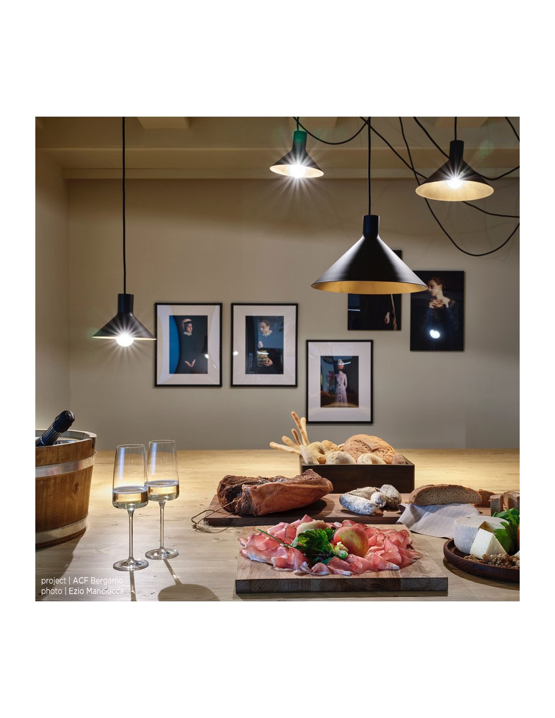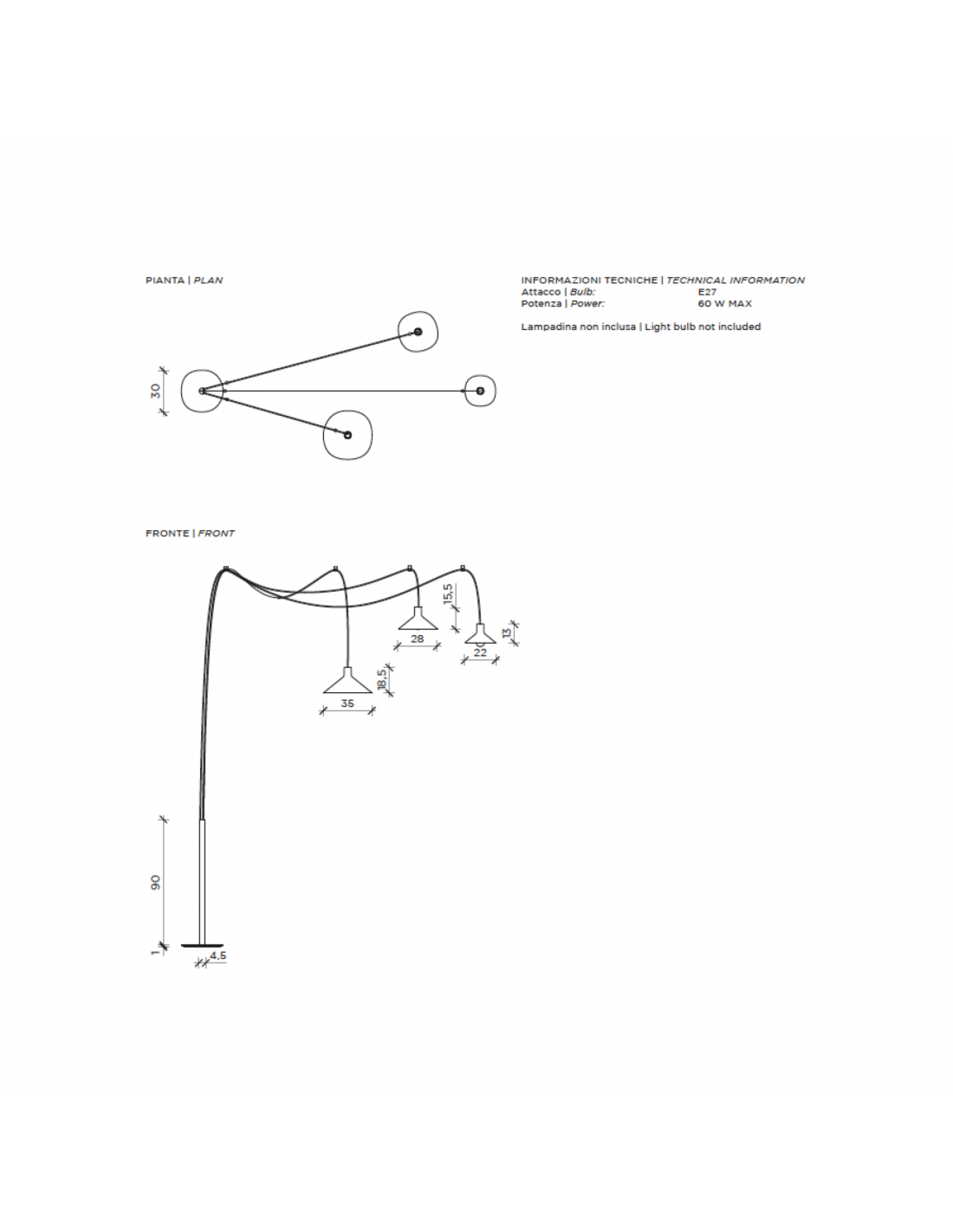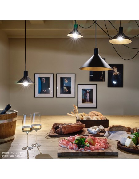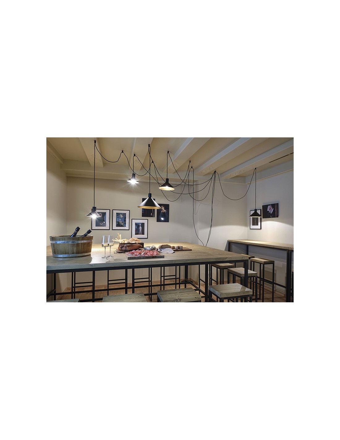 - Configurazione 5 paralumi: 3 cavi ( lungh. 4-4-6-8 mt. ) + 3 paralumi (diam 22cm, diam. 28cm, diam 35 cm) + 12 supporti a soffitto;