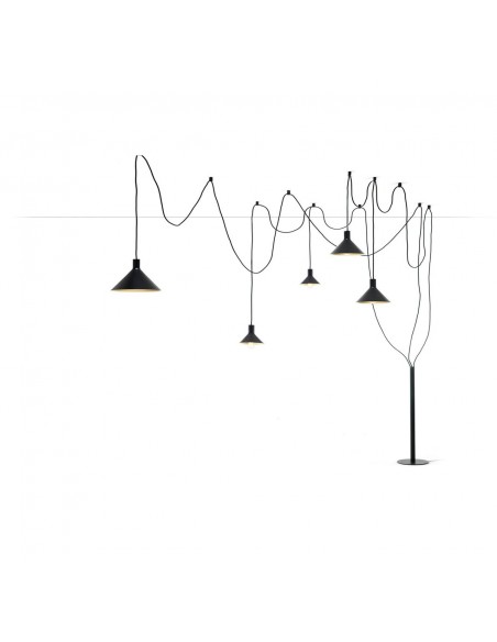 Cerberina è una lampada da terra con base in metallo nero e con una serie di paralumi sospesi nell'aria.