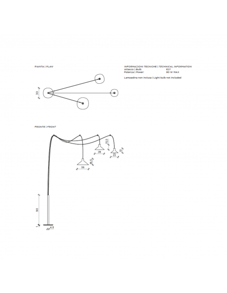 - Configurazione 3 paralumi: 3 cavi ( lungh. 4-6-8 mt. ) + 3 paralumi (diam 22cm, diam. 28cm, diam 35 cm) + 8 supporti a soffitto;