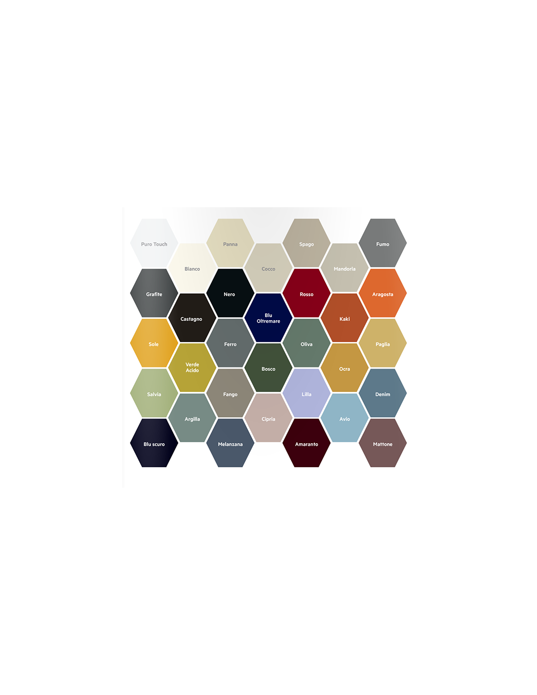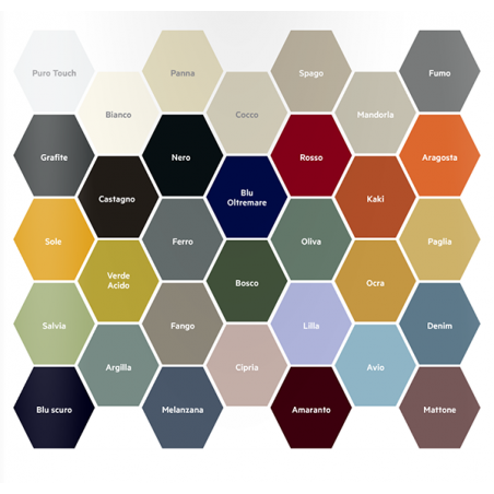 - Campionario colori vetro lucido: Amaranto, aragosta, argilla, avio, bianco, blu oltremare, blu scuro, bosco, castagno, cipria, cocco, denim, fango, ferro, fumo, grafite, kaki, lilla, mandorla, mattone, melanzana, nero, oliva, ocra, panna, paglia, puro touch, rosso, salvia, sole, spago, specchio, verde acido