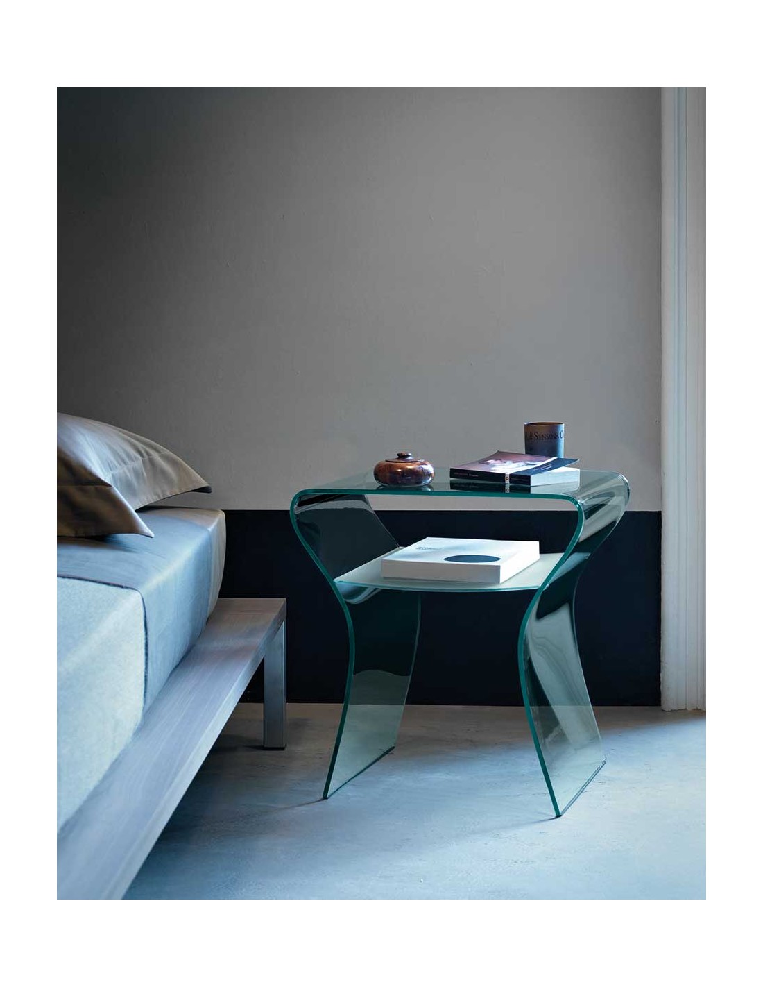 Prospero Rasulo ha disegnato per Fiam la collezione Charlotte, che comprende una consolle e un comodino. Quest’ultimo, denominato Charlotte De Nuit, è un comodino realizzato interamente in vetro curvato trasparente. Come la consolle, è privo di decorazioni o accessori, caratteristica che esalta la sua essenzialità come elemento distintivo. Questo complemento d'arredo risulta inoltre estremamente versatile e adatto a qualunque tipologia di ambiente. È inoltre possibile acquistare un piano d'appoggio interno in vetro e una consolle della stessa collezione.