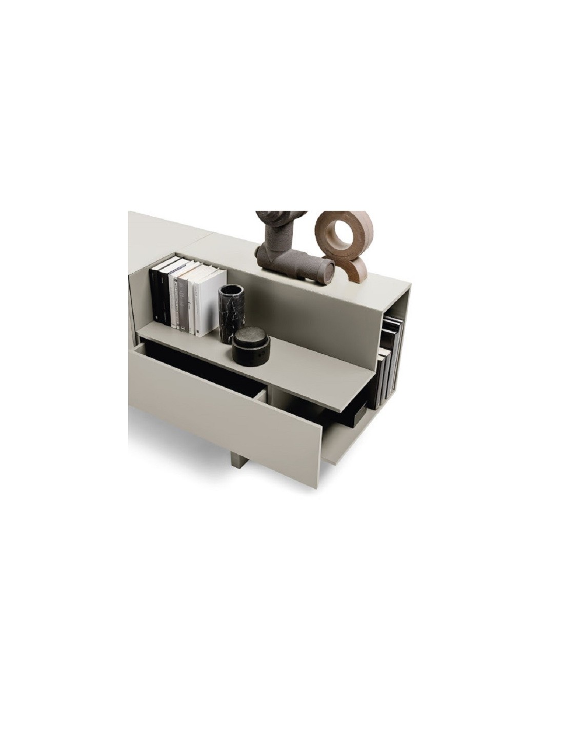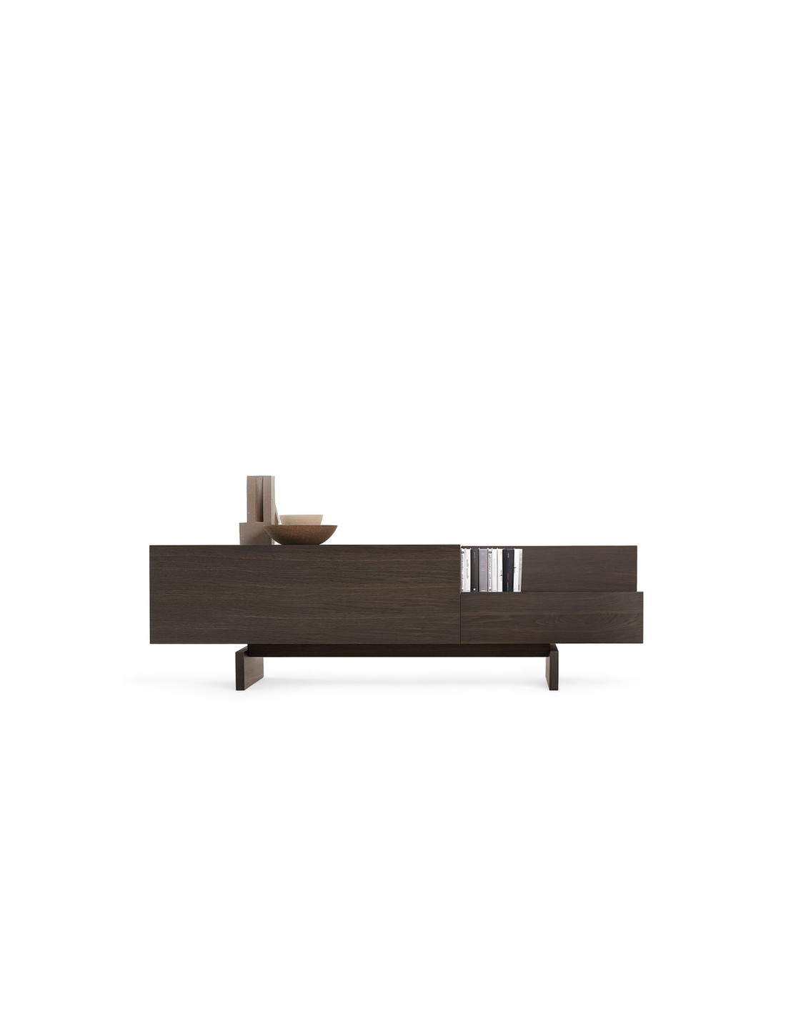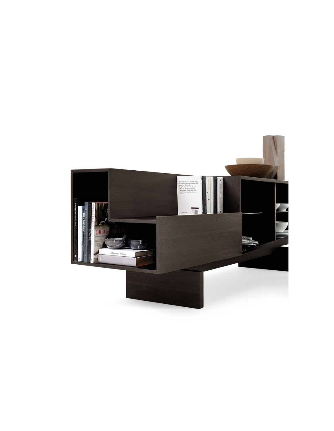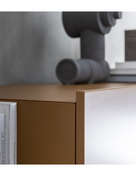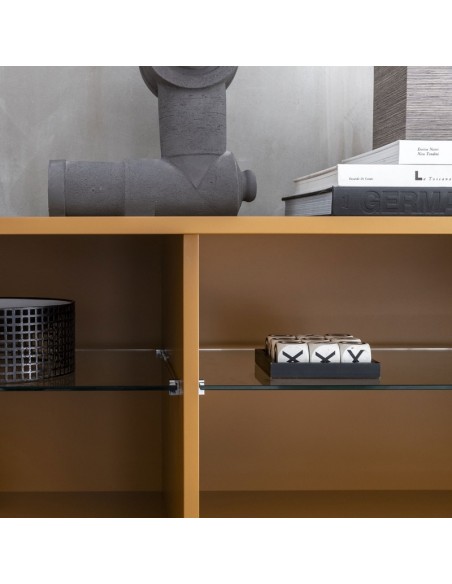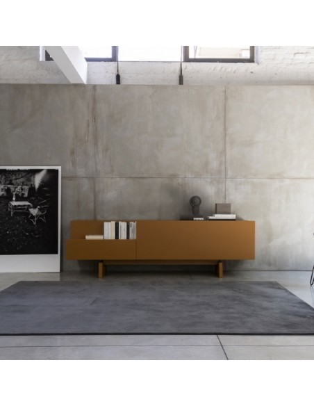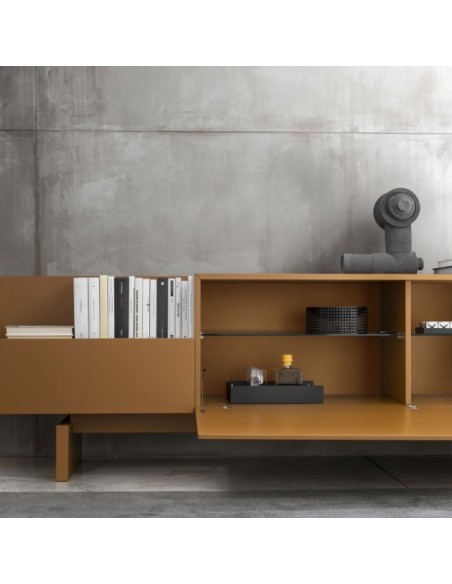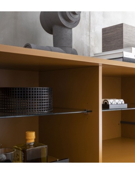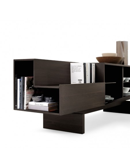 Ella è una credenza dal design lineare grazie a elementi semplici e puri affiancati e sovrapposti, di vuoti e di pieni che assumono un carattere anche architettonico all'interno di qualsiasi ambiente.