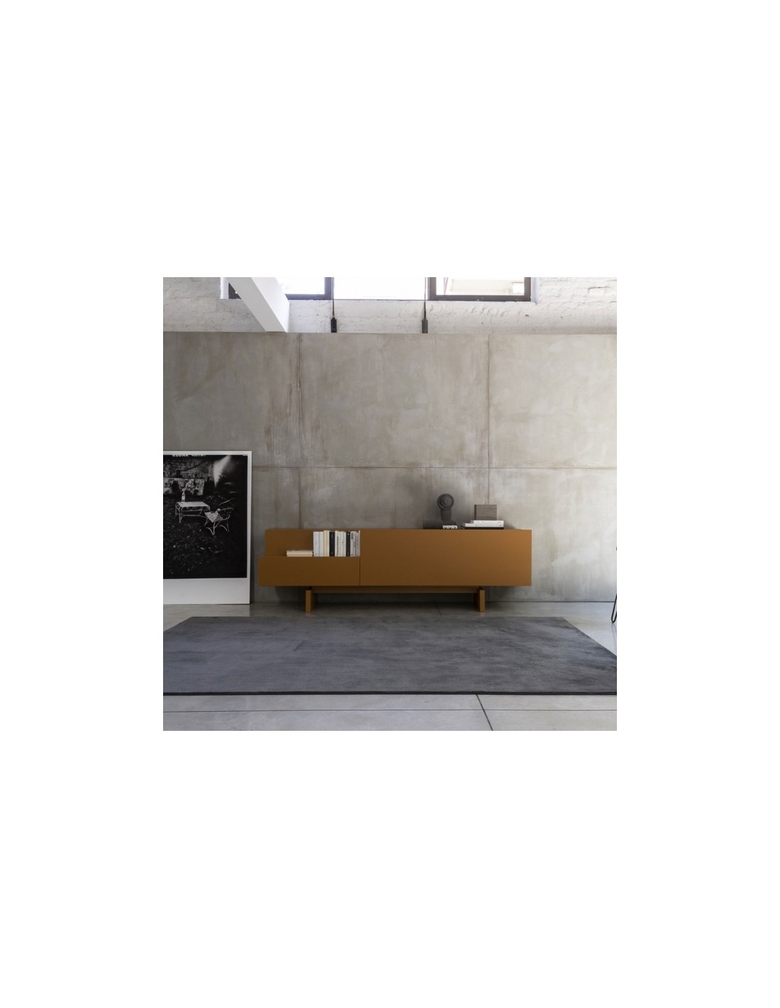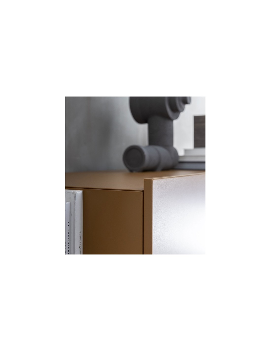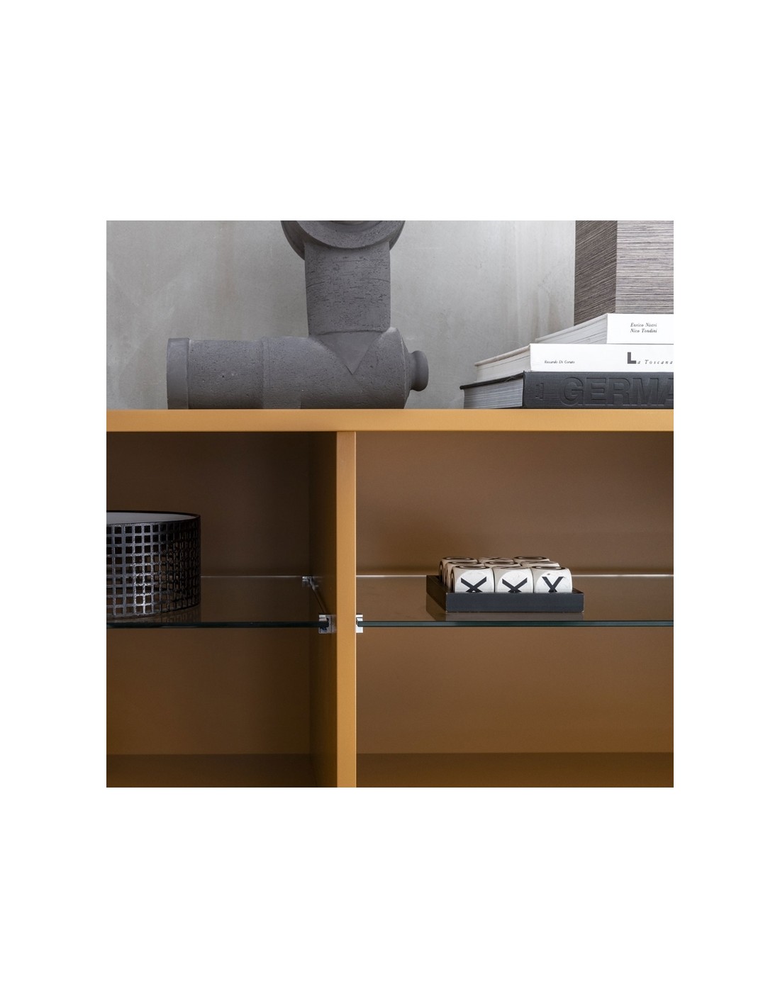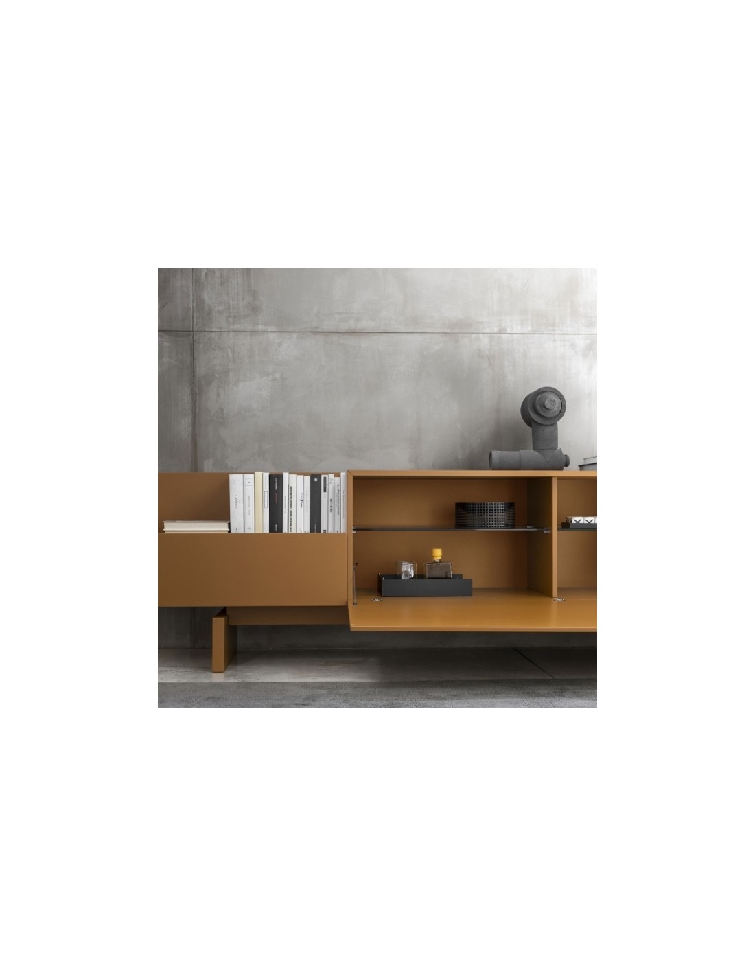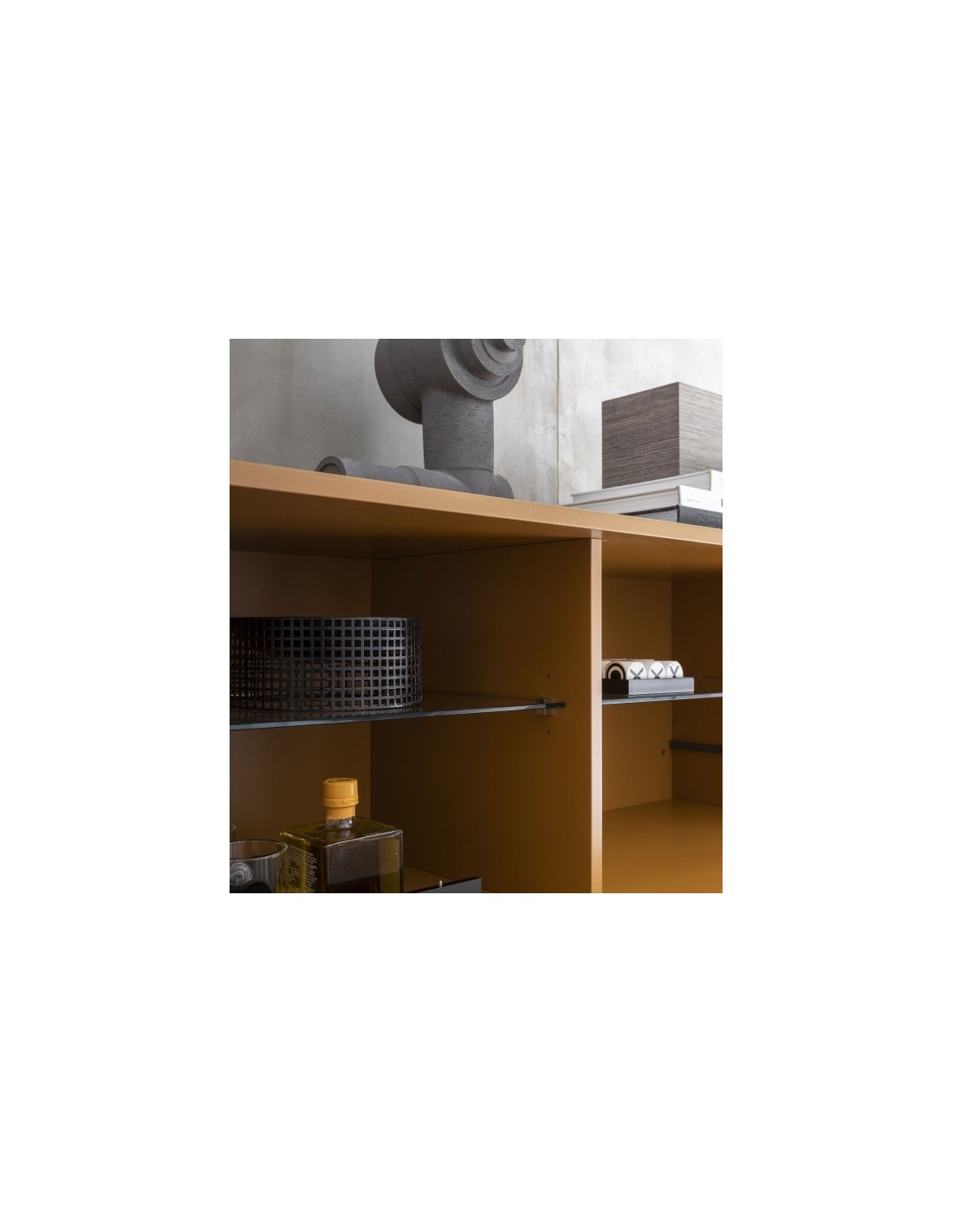 Ella è una credenza dal design lineare grazie a elementi semplici e puri affiancati e sovrapposti, di vuoti e di pieni che assumono un carattere anche architettonico all'interno di qualsiasi ambiente.