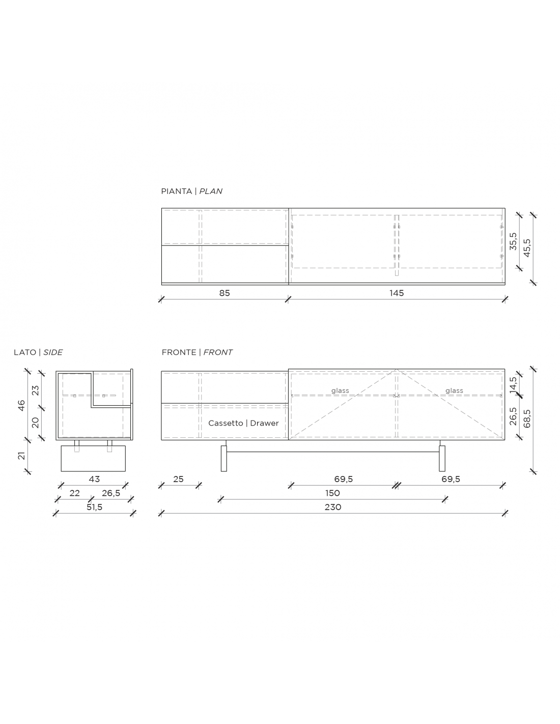 - Dimensione : H. 69 X L. 230 X P. 52 (cm)