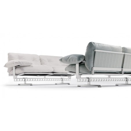 Linee tradizionali della seduta abbinate a un elemento di forte impatto visivo, Ouverture ha come basamento una trave in acciaio traforato dove scorrono i piedi e in cui si poggia la struttura realizzata in profilati d'acciaio verniciata nel colore grigio allumino metallizzato. Il molleggio è ottenuto grazie a una sospensione elastica in nylon e gomma vulcanizzata, l'imbottitura è in poliuretano espanso e piuma d'oca, il rivestimento in pelle Frau o in tessuto sfoderabile.