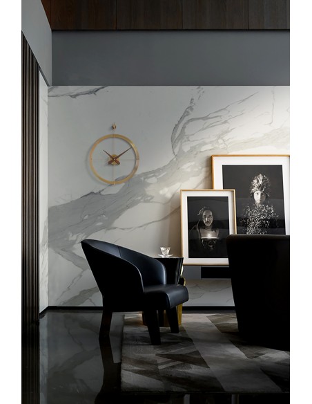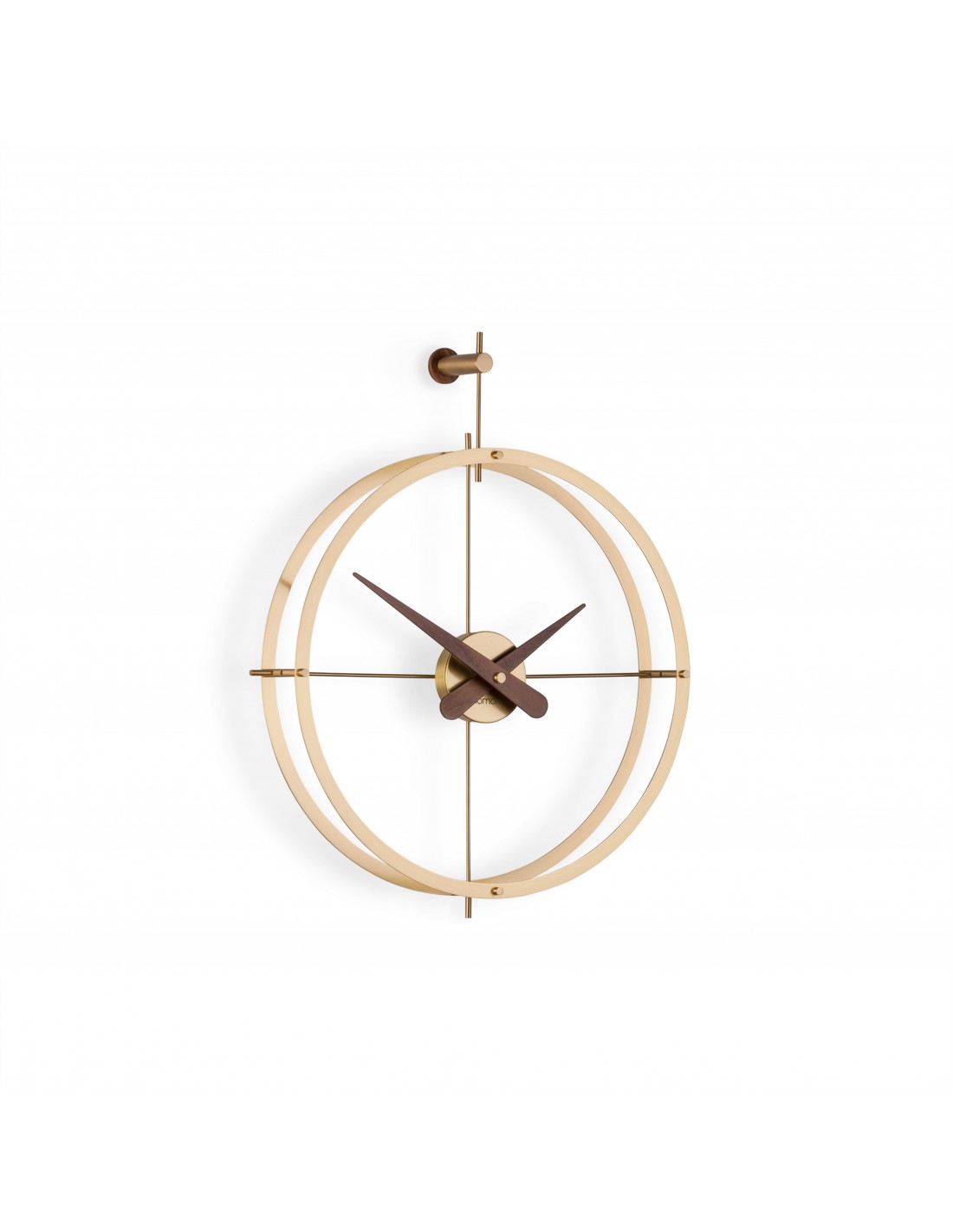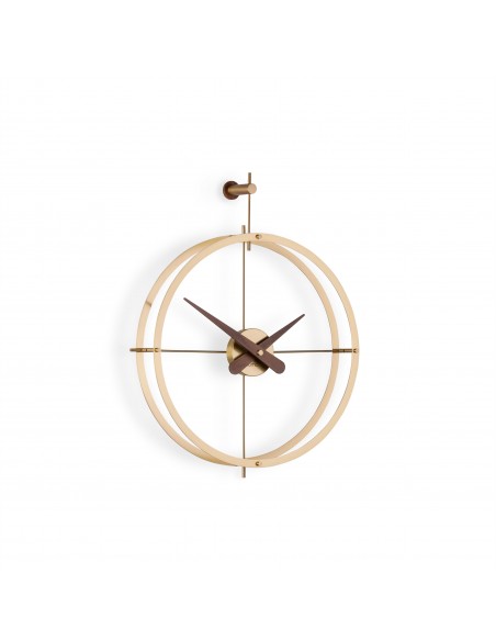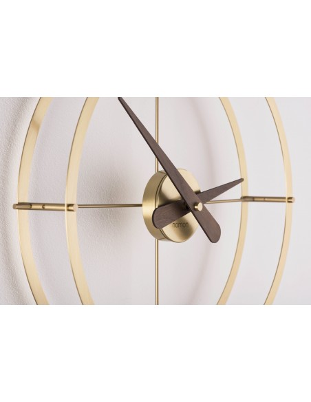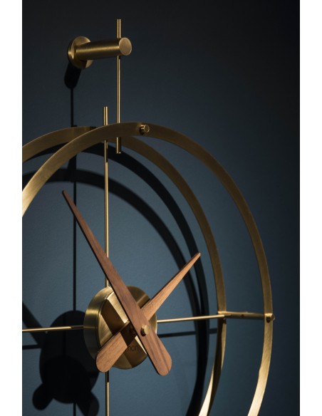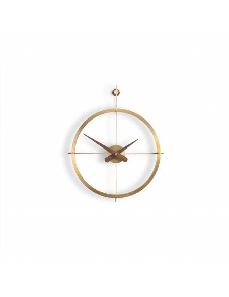 Dos Puntos Premium Gold è un orologio da parete che indubbiamente offrirà un aspetto unico al vostro ambiente, grazie al suo design elegante e ma al tempo stesso raffinato. La struttura, composta da due anelli rifiniti in ottone lucido, è abbinata alle lancette ed al supporto in legno di noce naturale.
