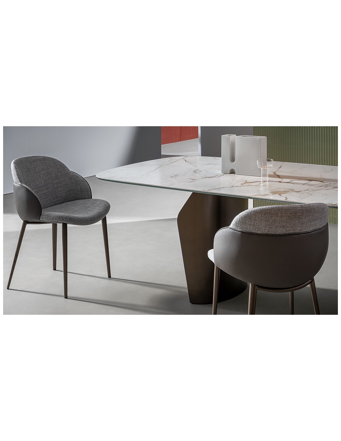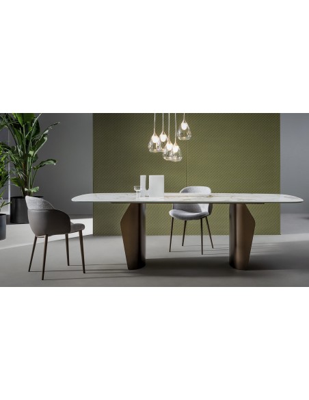 Il tavolo Flame, disegnato da Gino Carollo, è la rappresentazione di convivialità e intimità ed è senza ombra di dubbio il complemento protagonista della zona living. Le caratteristiche principali di Flame sono l’armonia delle forme, la leggerezza e la sinuosità suoi dei volumi. Il piano, visivamente sospeso, è utilizzabile completamente grazie al posizionamento del doppio basamento, studiato per ottimizzare lo spazio di ingombro. È disponibile in numerose e ricercate finiture – dal legno alla ceramica, fino al marmo. Per la base è possibile scegliere tra diverse varianti di metallo.