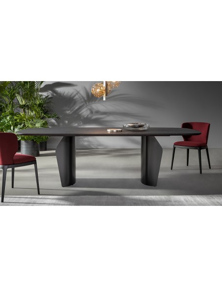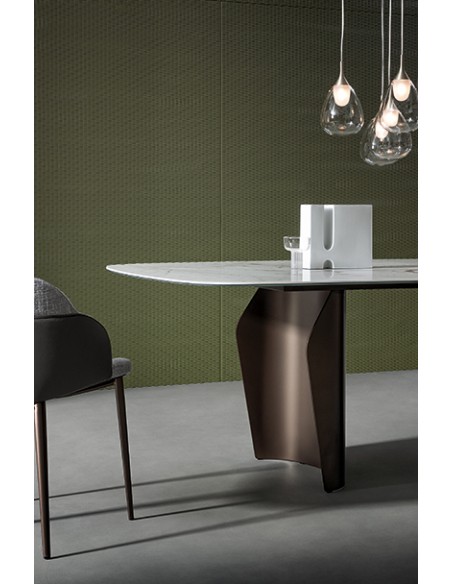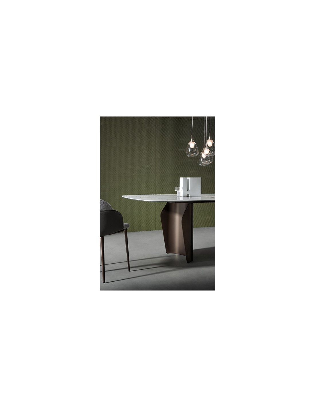 Il tavolo Flame, disegnato da Gino Carollo, è la rappresentazione di convivialità e intimità ed è senza ombra di dubbio il complemento protagonista della zona living. Le caratteristiche principali di Flame sono l’armonia delle forme, la leggerezza e la sinuosità suoi dei volumi. Il piano, visivamente sospeso, è utilizzabile completamente grazie al posizionamento del doppio basamento, studiato per ottimizzare lo spazio di ingombro. È disponibile in numerose e ricercate finiture – dal legno alla ceramica, fino al marmo. Per la base è possibile scegliere tra diverse varianti di metallo.