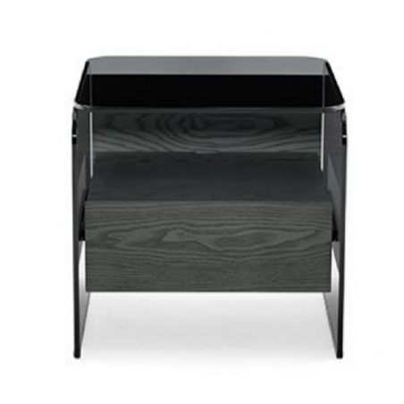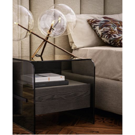 Comodino con un cassetto. Struttura in frassino tinto nero poro aperto oppure tinto grigio smoke. Cassetto montato su guide a estrazione totale. Piano superiore e fianchi in cristallo temperato fumé “grigio Italia” oppure cristallo extralight 10mm. Parti metalliche in alluminio spazzolato anodizzato nero. Dotato di piano superiore del cassetto in frassino tinto nero poro aperto oppure tinto grigio smoke come la struttura. Su richiesta disponibile in cristallo decorato Craquelé oppure nella finitura Cashmere nei colori gold grey o anthracite.
