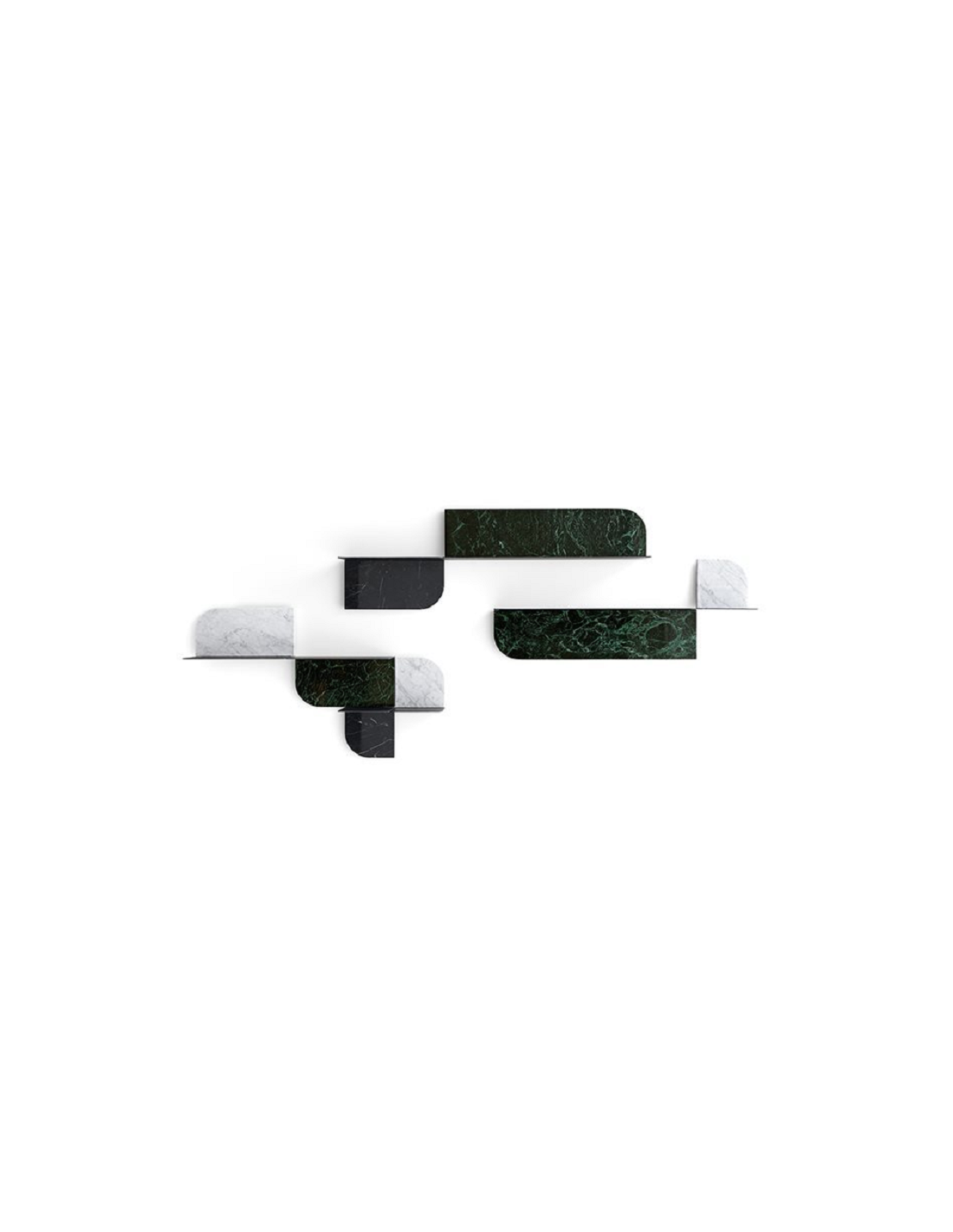 Roundcut è un sistema modulare di mensole con ripiano in metallo brunito a mano. Frontale in marmo a scelta tra Bianco Carrara, Nero Marquinia, Calacatta Vagli Oro, Stardust Grey, Verde Alpi, Fior di Pesco, Travertino Romano oppure disponibile in specchio extralight. Versione sinistra (L) e destra (R) per ciascuna misura. Le mensole possono essere installate in due diverse posizioni (con mensola sopra o sotto), ruotandole di 180°.