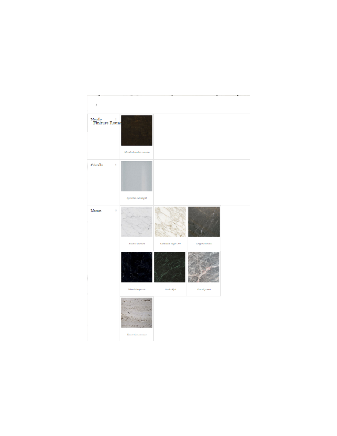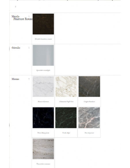 - Finitura marmo: Bianco Carrara, Nero Marquinia, Calacatta Vagli Oro, Stardust Grey, Verde Alpi, Fior di Pesco, Travertino Romano