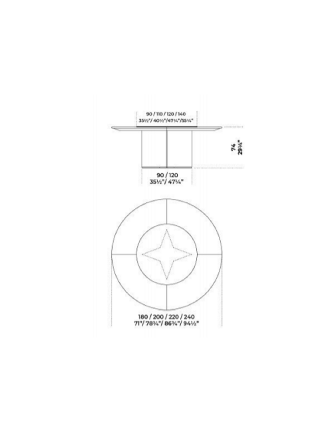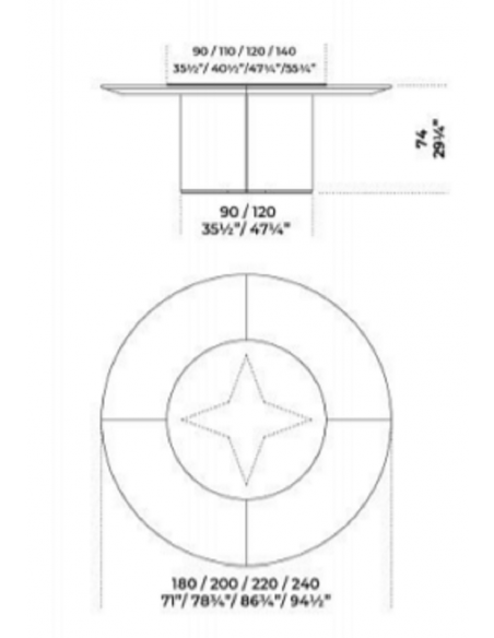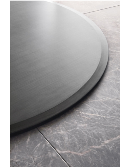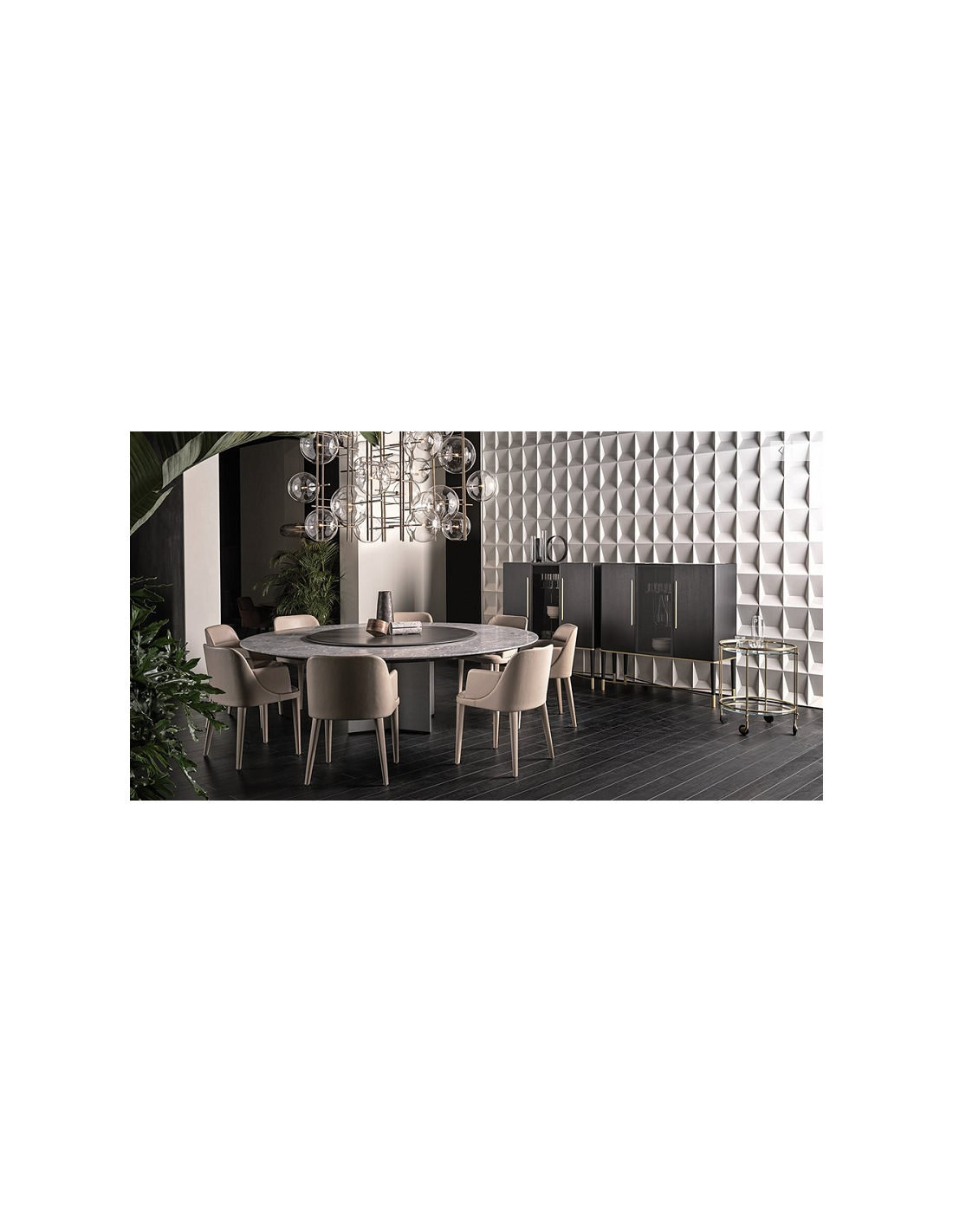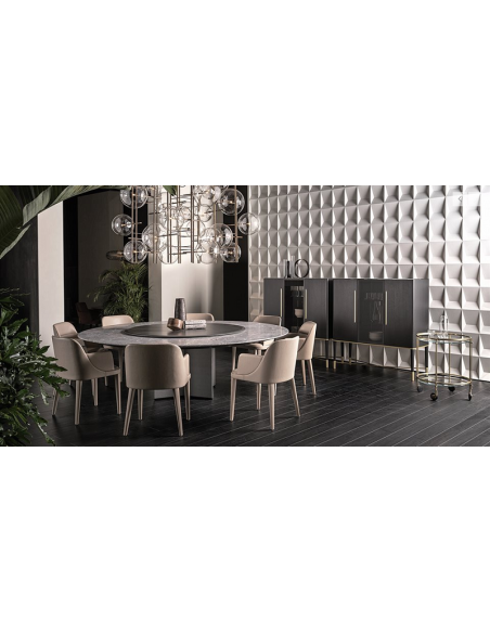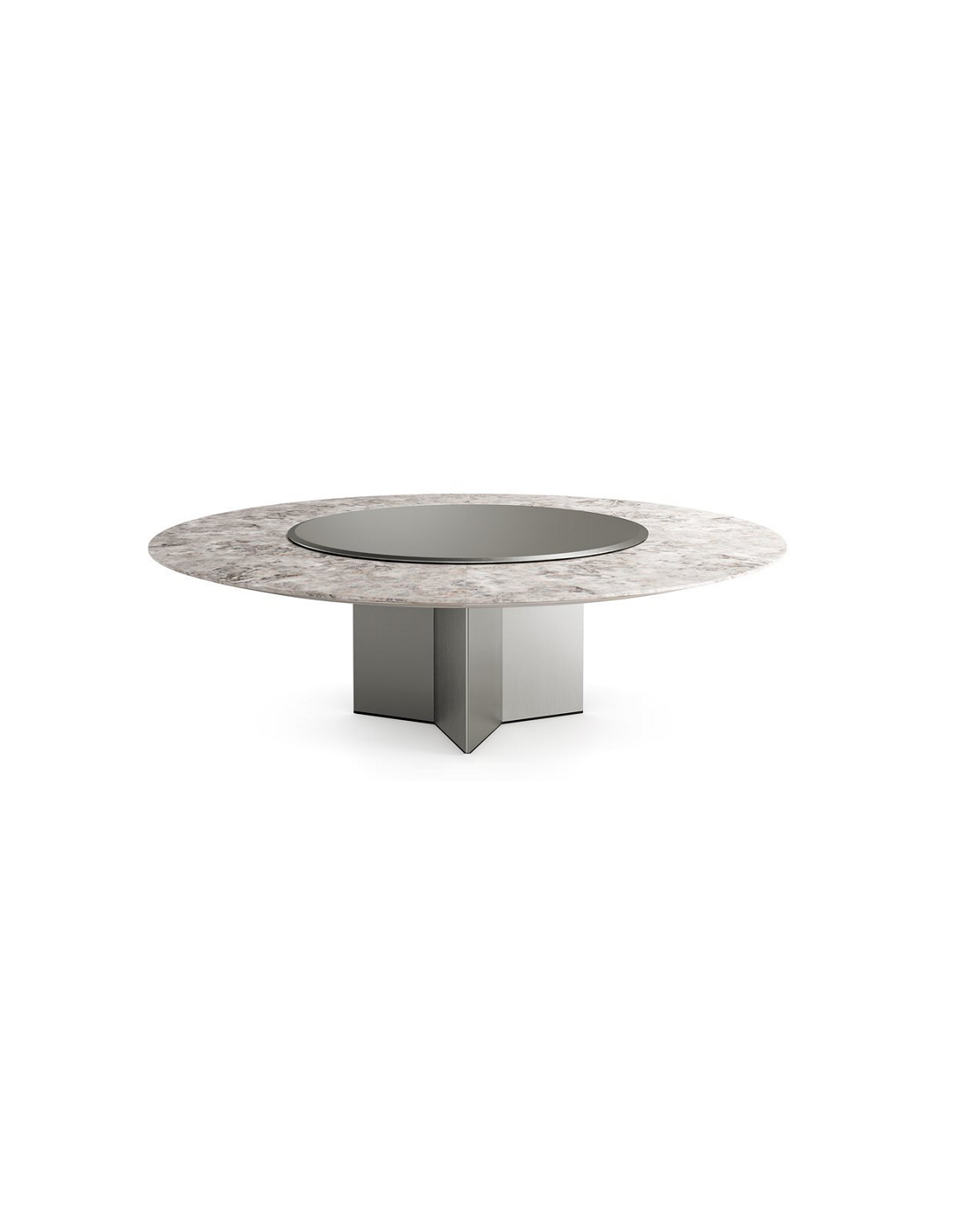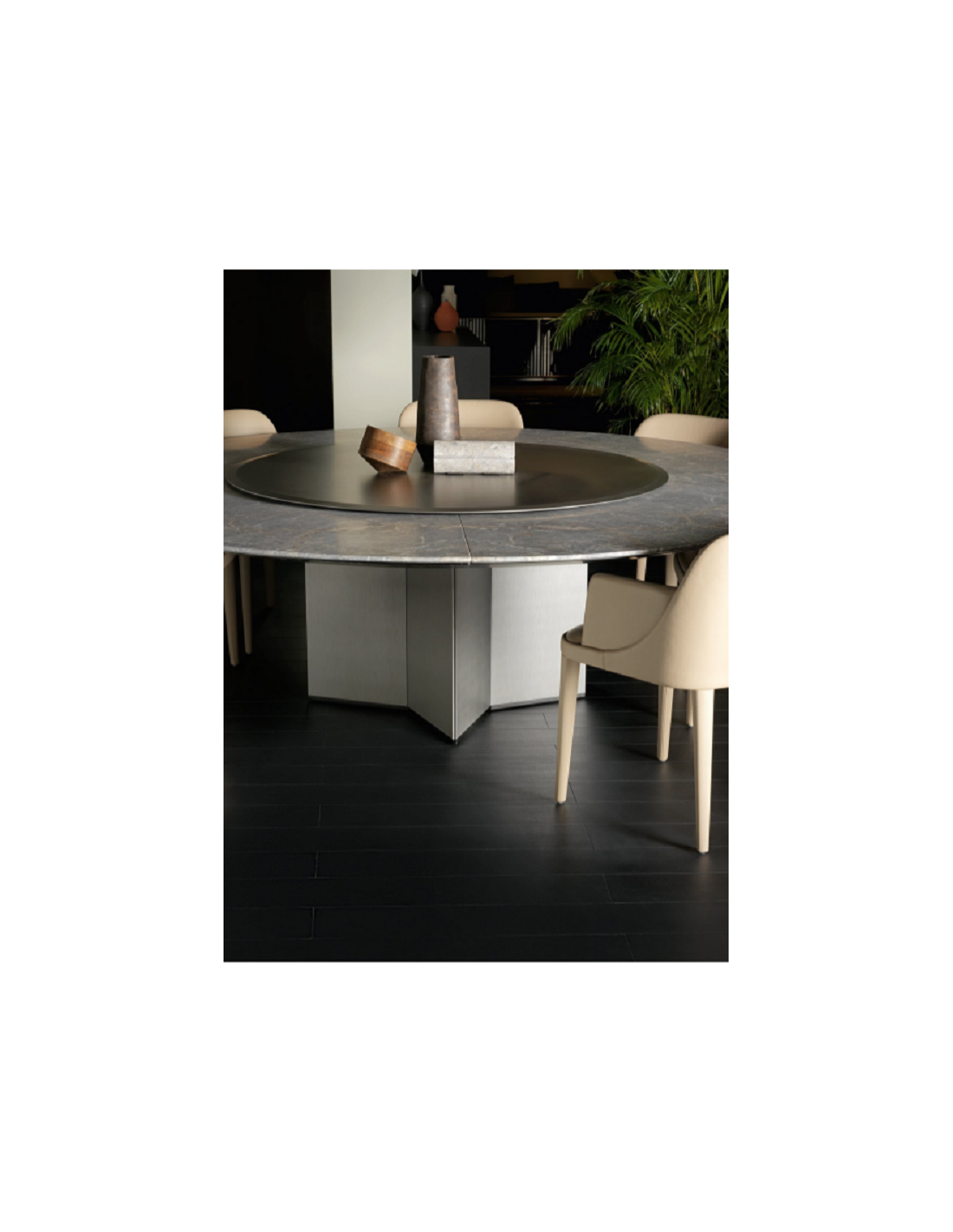 Tavolo con piano in legno o marmo diviso in quattro sezioni e girevole in cristallo 10mm. Base in legno rivestita in cristallo 6mm temperato.