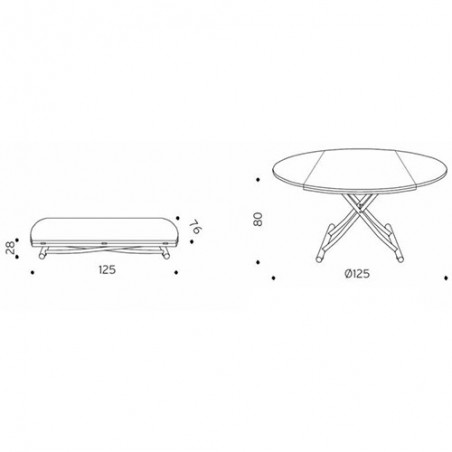 - Dimensioni: L. 125 x P. 76 → Ø 125 x H. 28 ↑ 80 cm