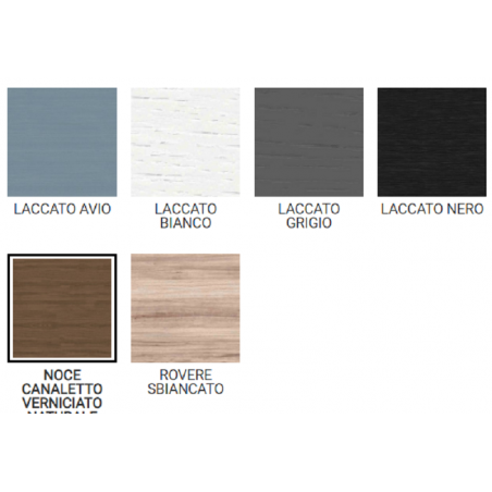 - Finitura: noce canaletto, rovere verniciati naturale, rovere laccato bianco, grigio, avio, nero.
