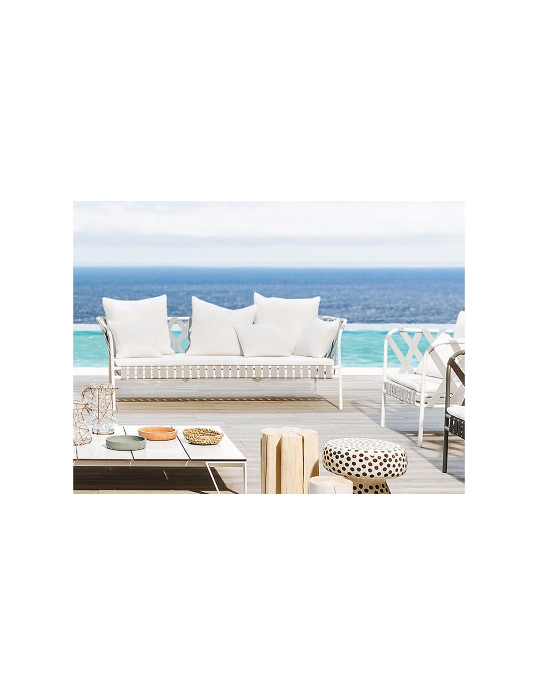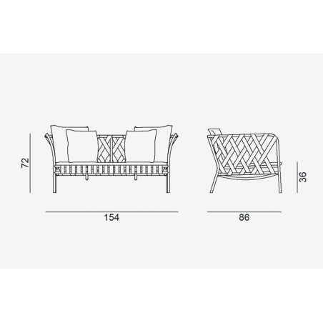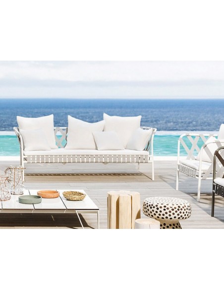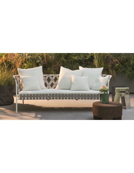Divano a due posti con struttura in tubolare di alluminio verniciato opaco intrecciata con cinghia elastica