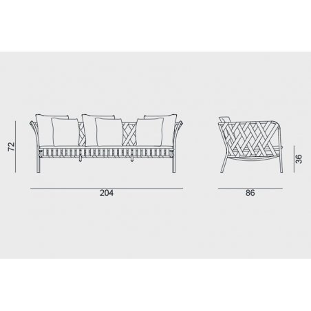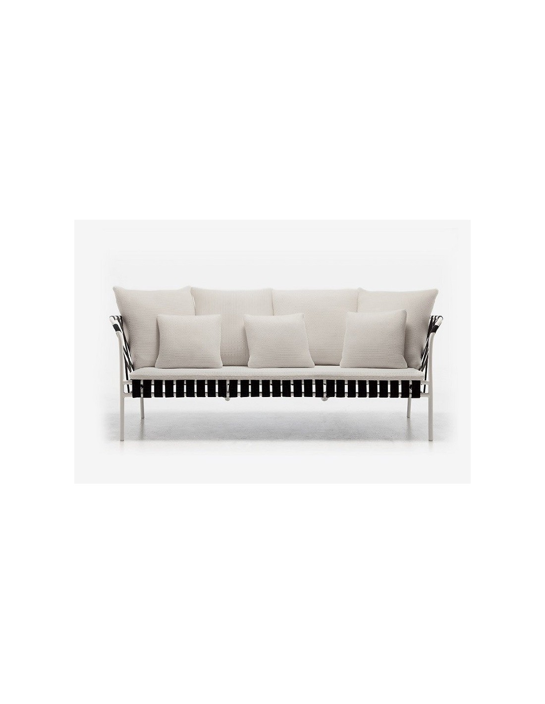 Divano a tre posti con struttura in tubolare di alluminio verniciato opaco intrecciata con cinghia elastica
