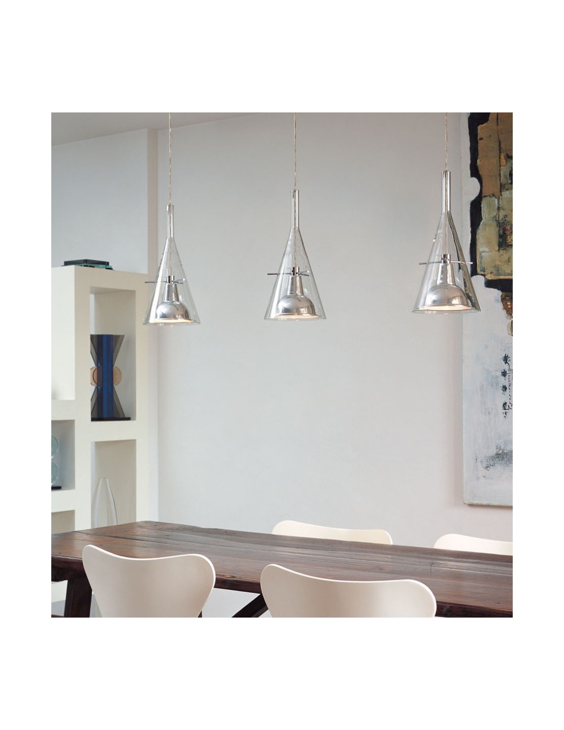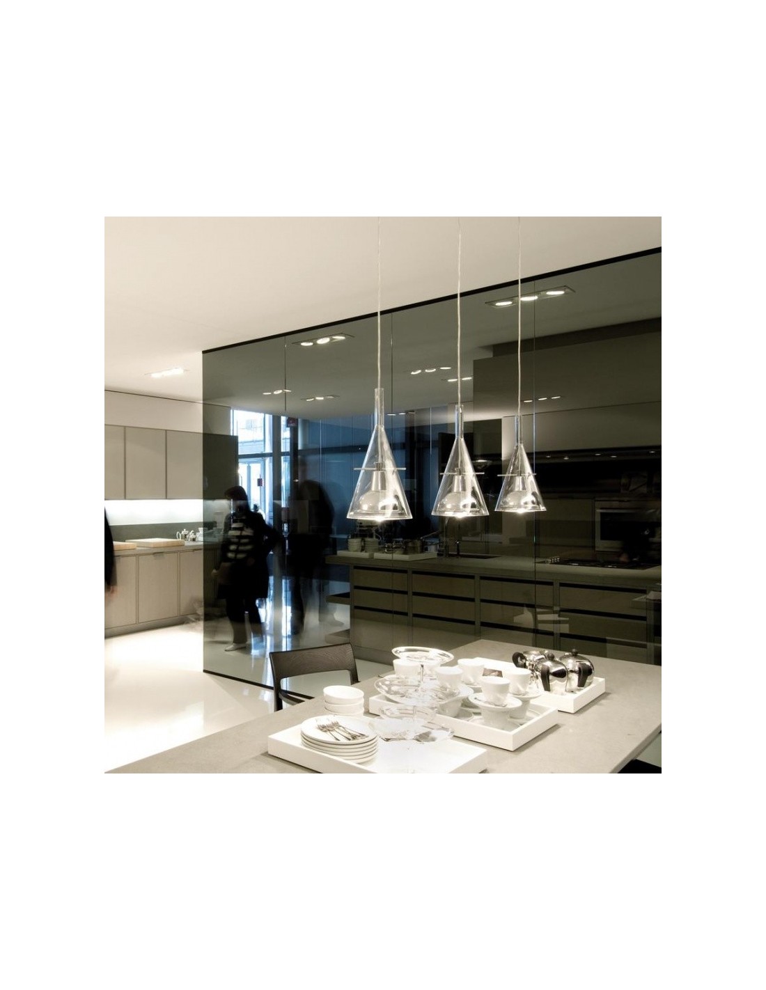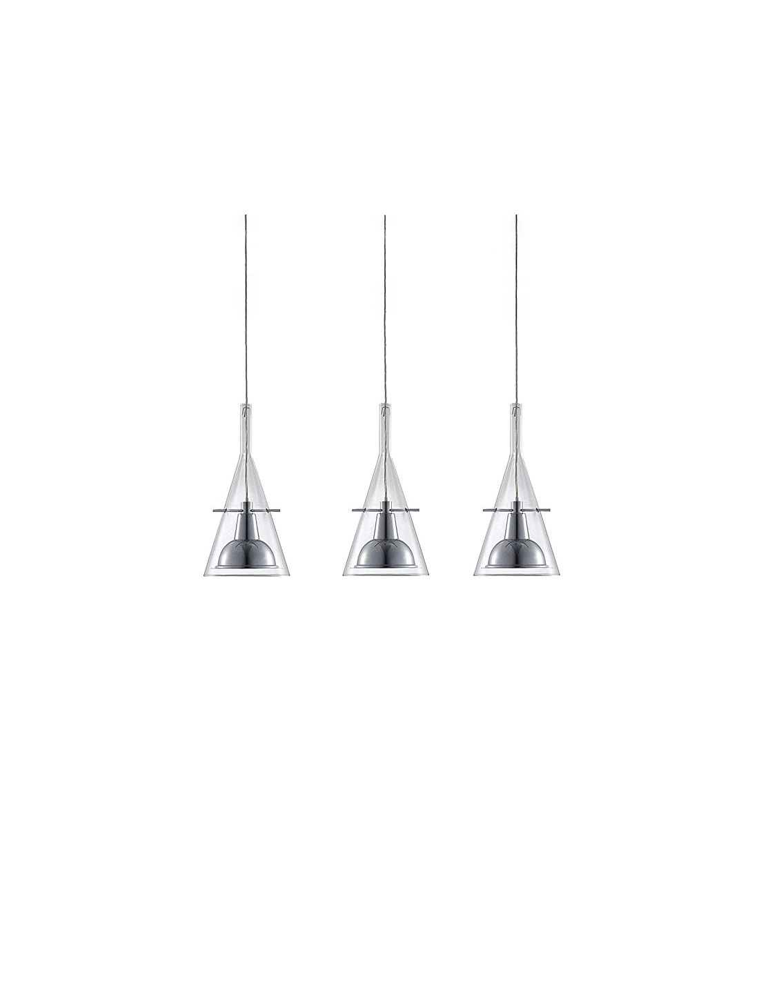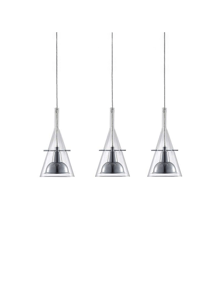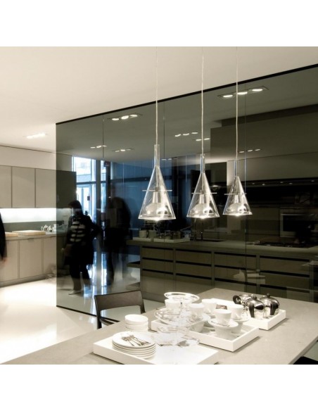 La lampada Flute Fontana Arte è disponibile nella versione a sospensione, a terra e da parete, è dotata di un paralume di forma conica realizzato in vetro borosilicato trasparente al cui interno presenta un riflettore in alluminio cromato sorretto da tre bracci.