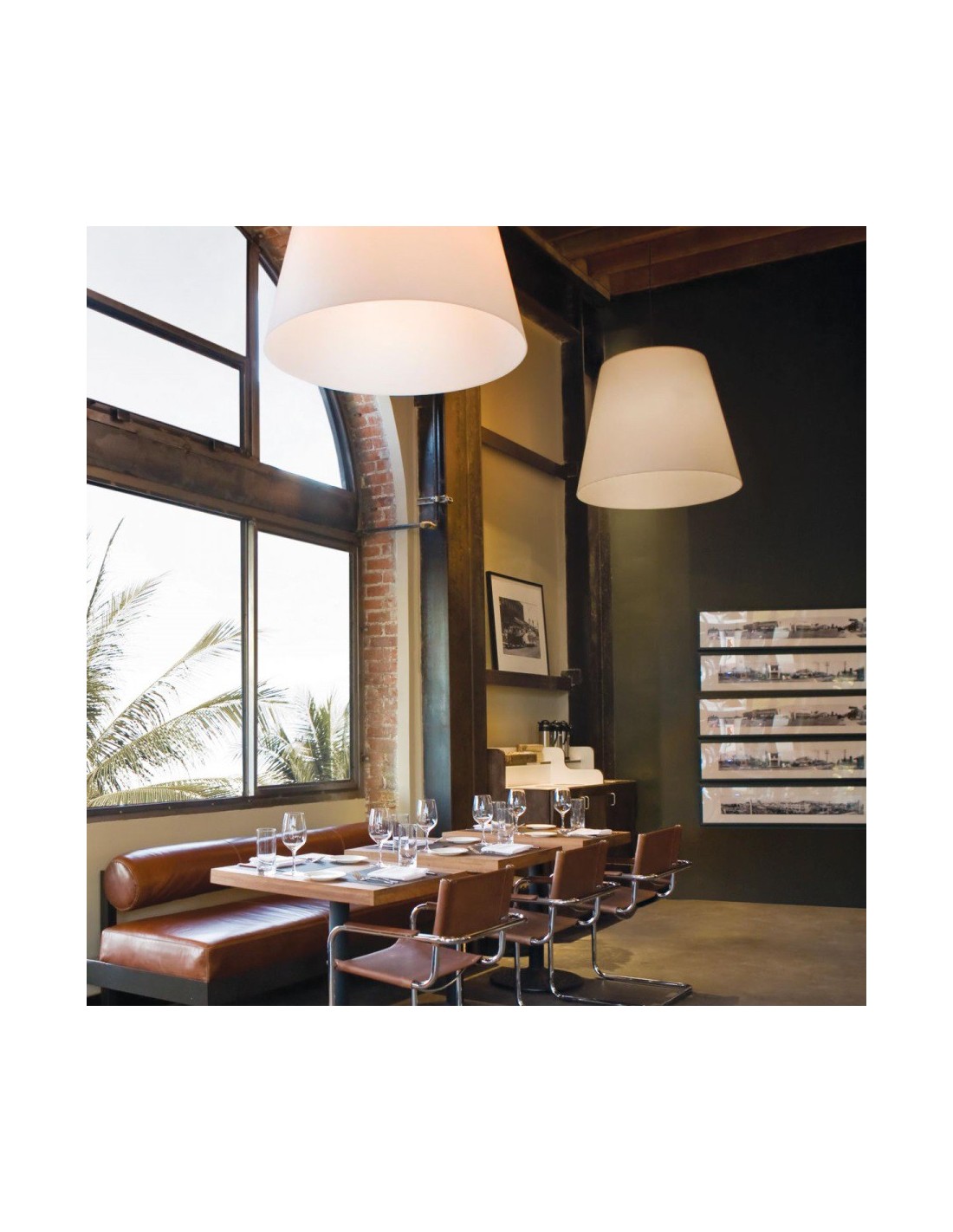 Si tratta di una lampada a sospensione dotata di struttura realizzata in metallo cromato e il paralume in polietilene colore bianco metalizzato