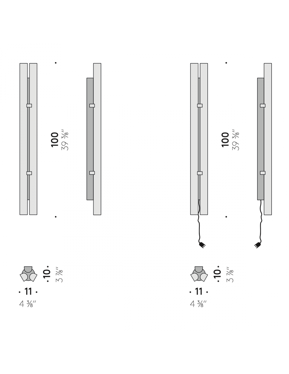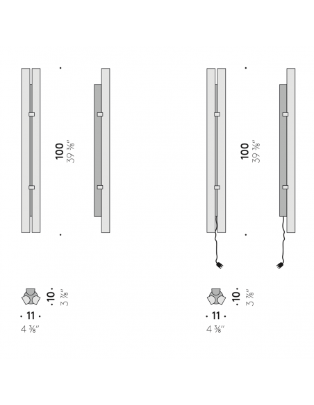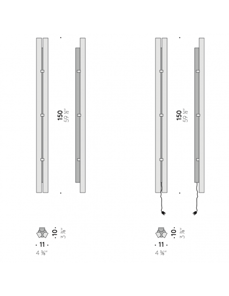 - Con alimentatore integrato nella lampada (output 24V), dimmer metal touch incluso con dimmerazione sincronizzata delle due fonti luminose.