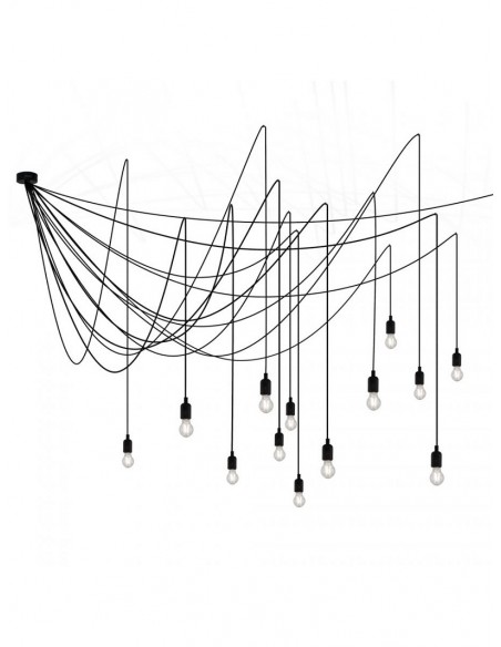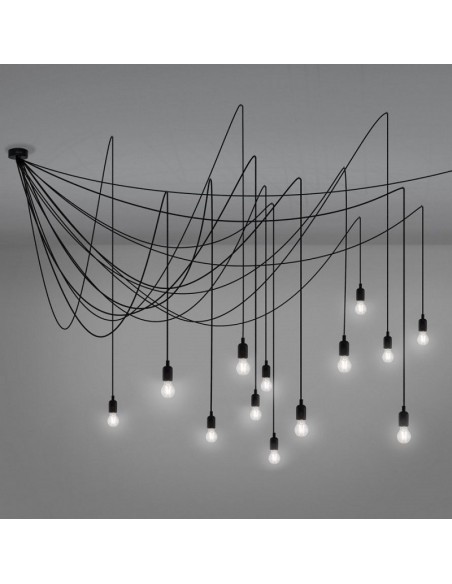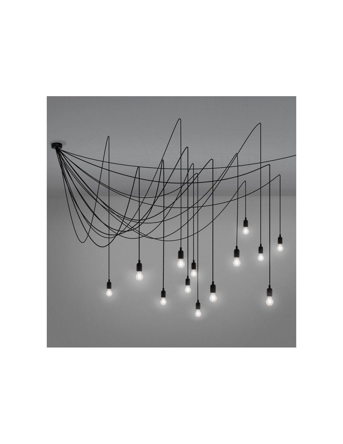 Lampadario tentacolare, spettacolare e scenografico: quattordici bracci lunghissimi dai quali sono sospese le lampadine formano una rete di luce dalle combinazioni infinite.