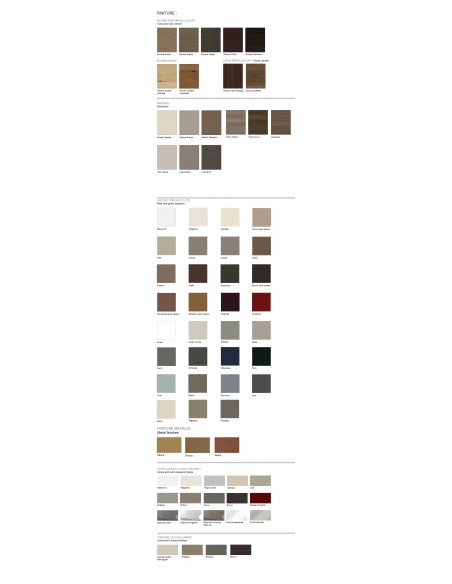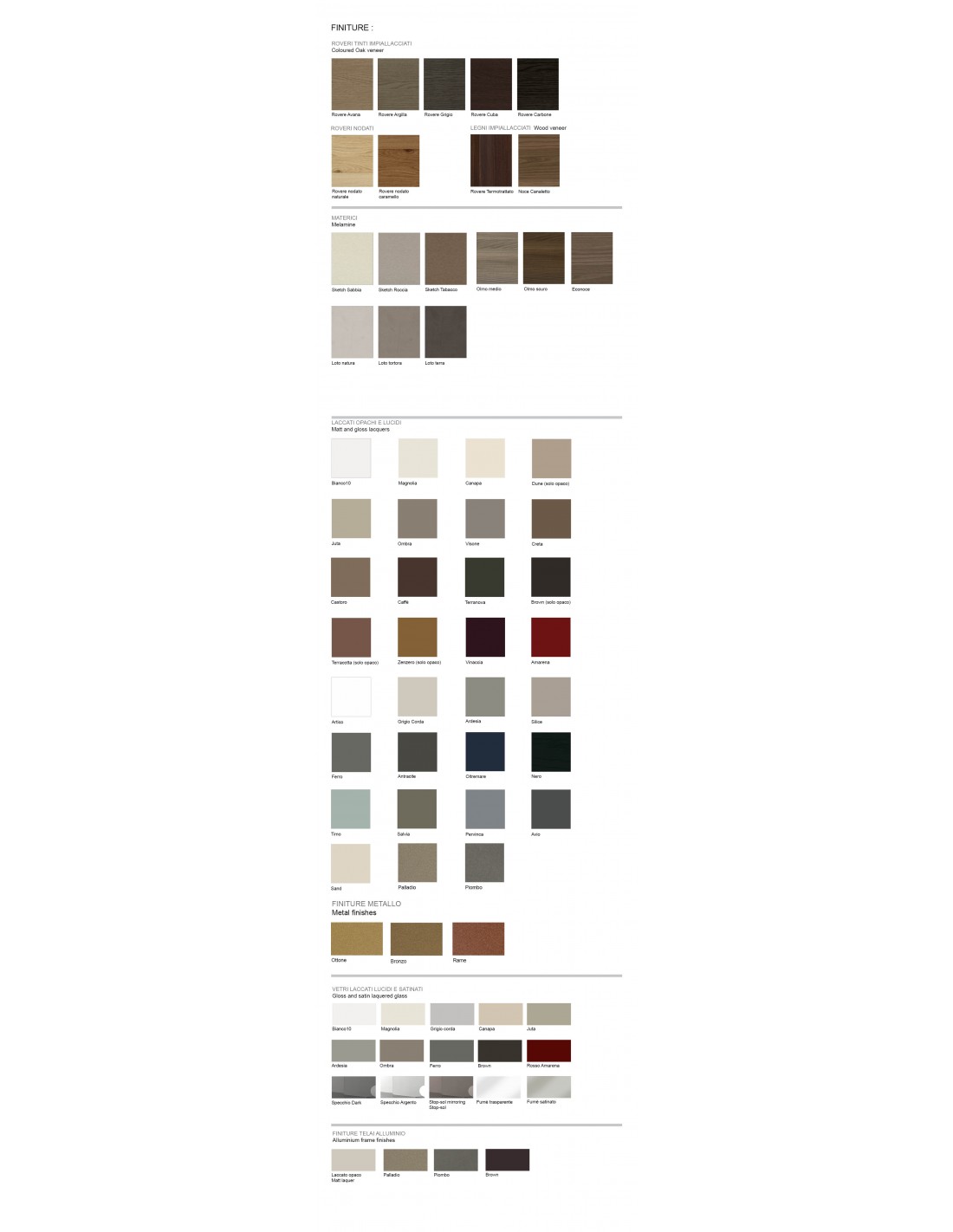Finiture: Ampia gamma di finiture per legno, laccato e metalli, possibilità di abbinamenti personalizzati con altri mobili della collezione