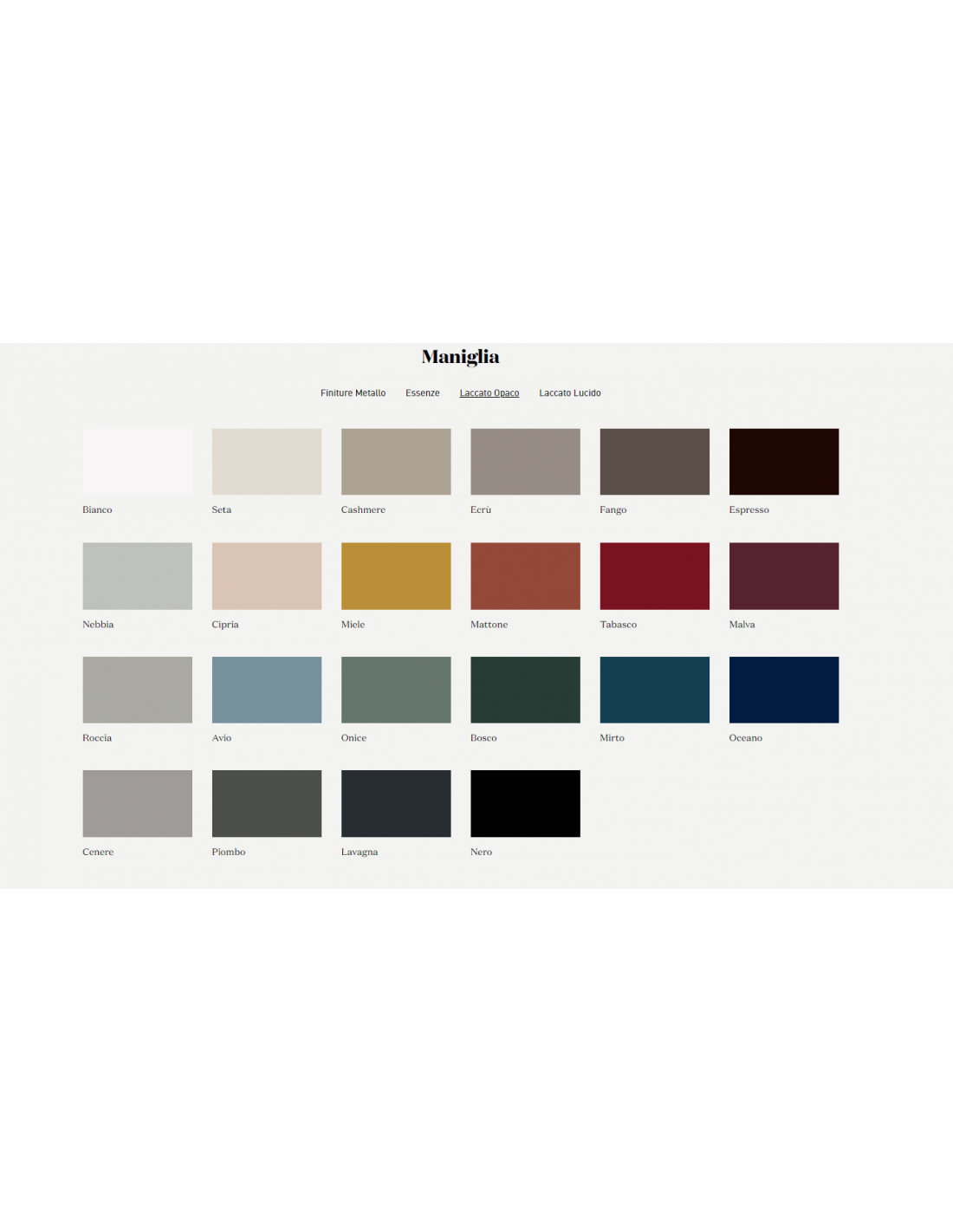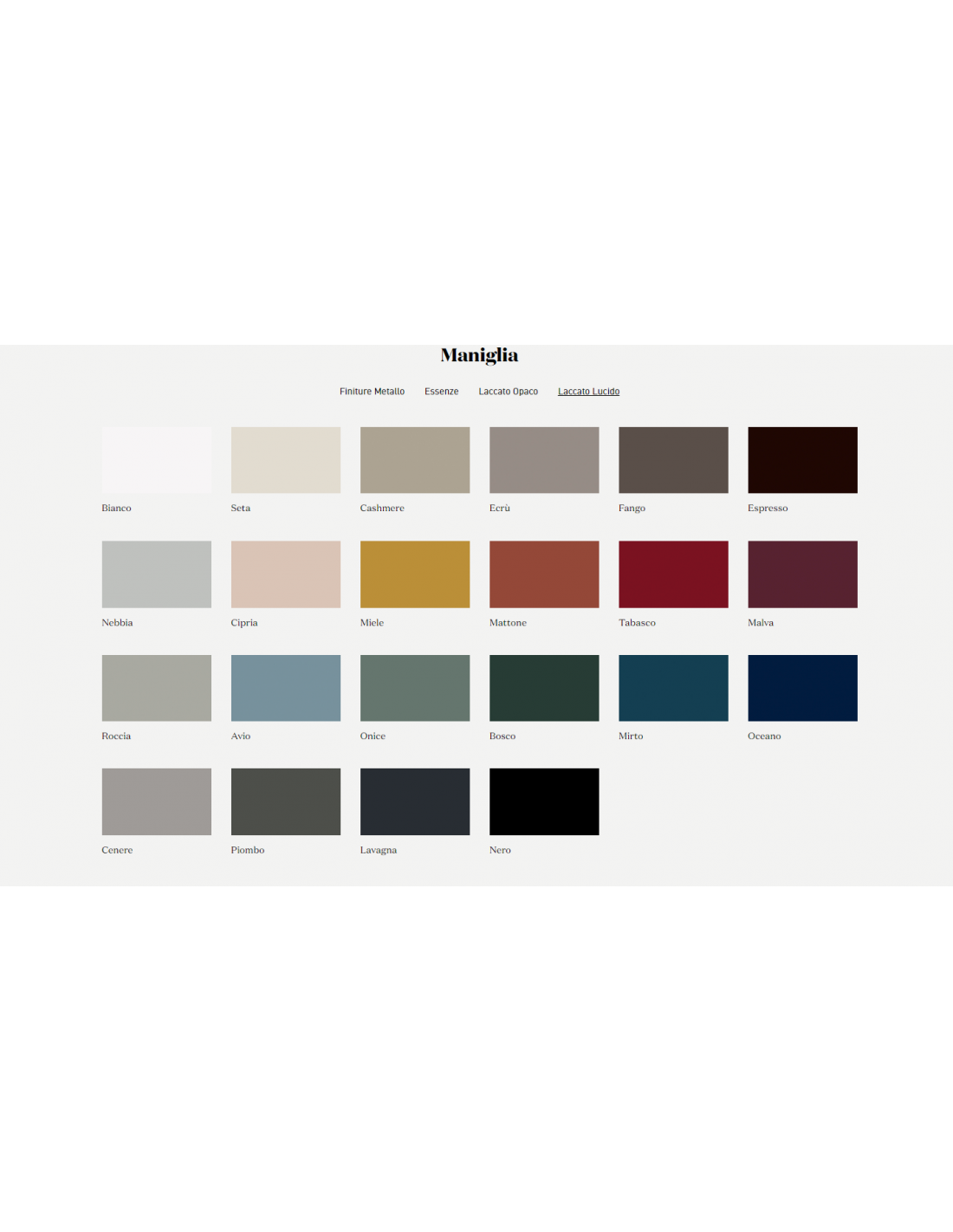 - Finitura maniglie: laccato opaco, essenza, lucido spazzolato, finitura metallo