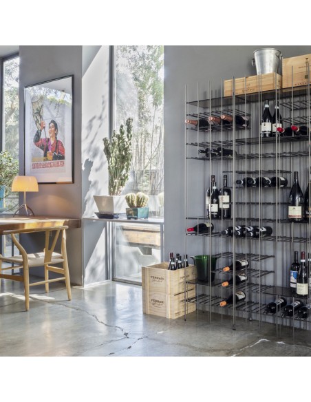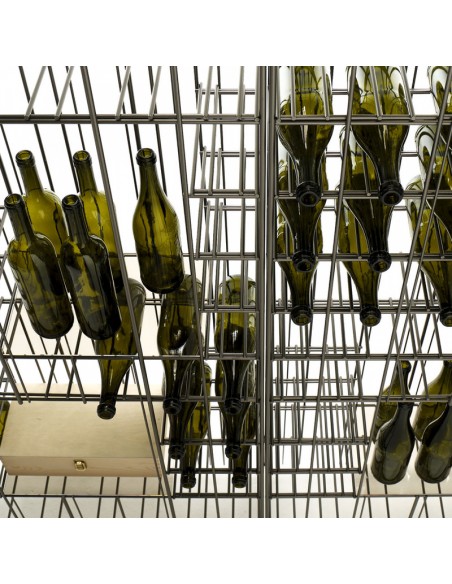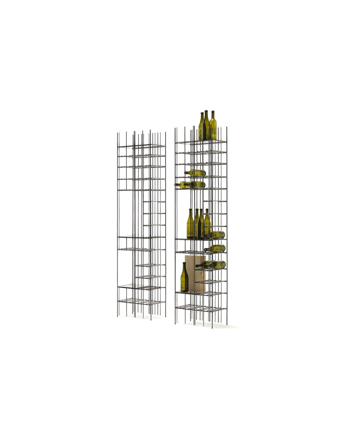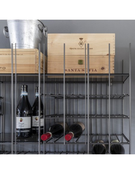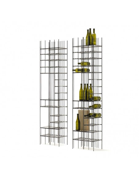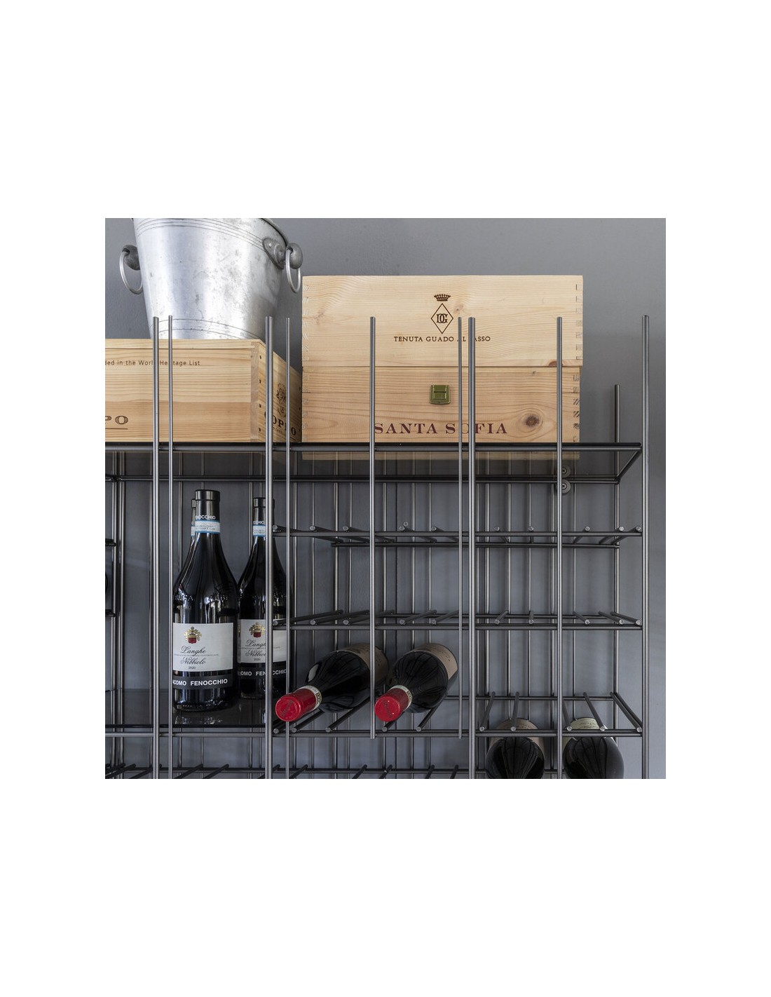 Metrica Wine è un portabottiglie caratterizzato da una struttura in metallo brunito il cui ritmo è scandito dalle bacchette di ferro entro i quali, le bottiglie e gli oggetti, ne completano la forma scrivendo di volta in volta nuove composizioni.