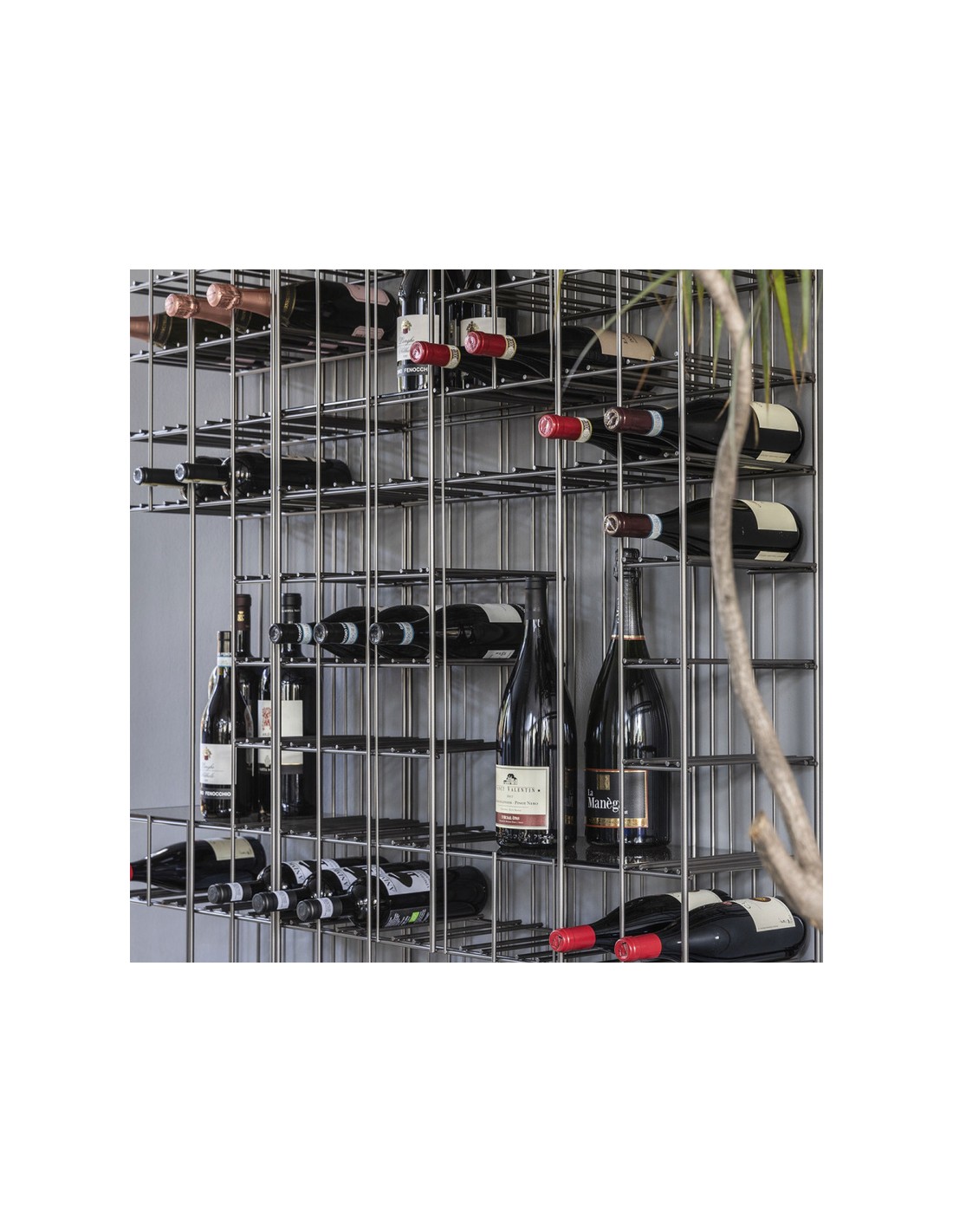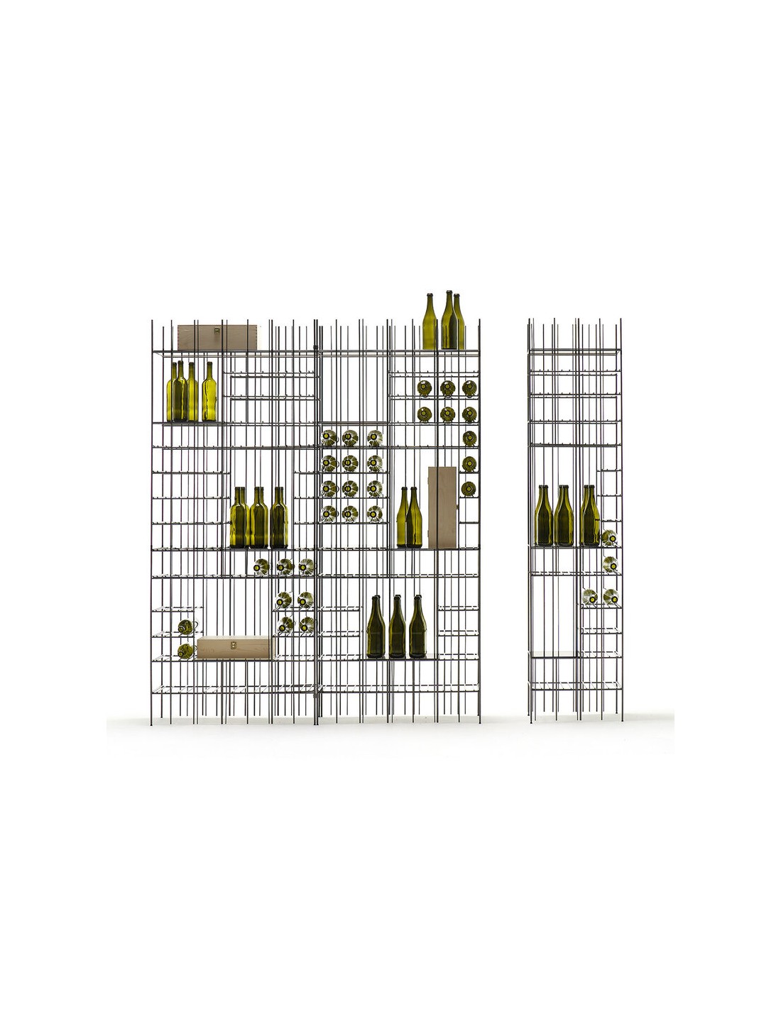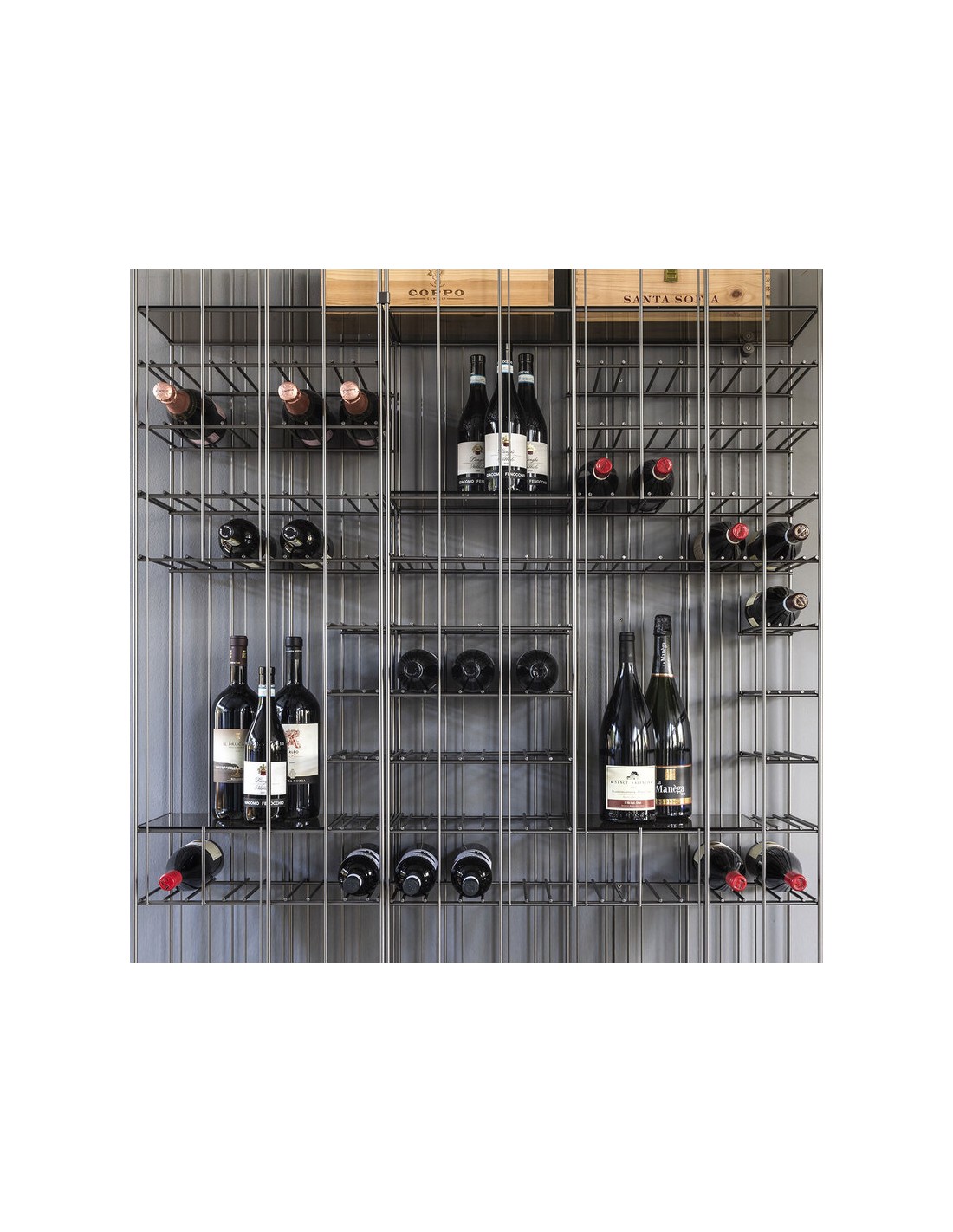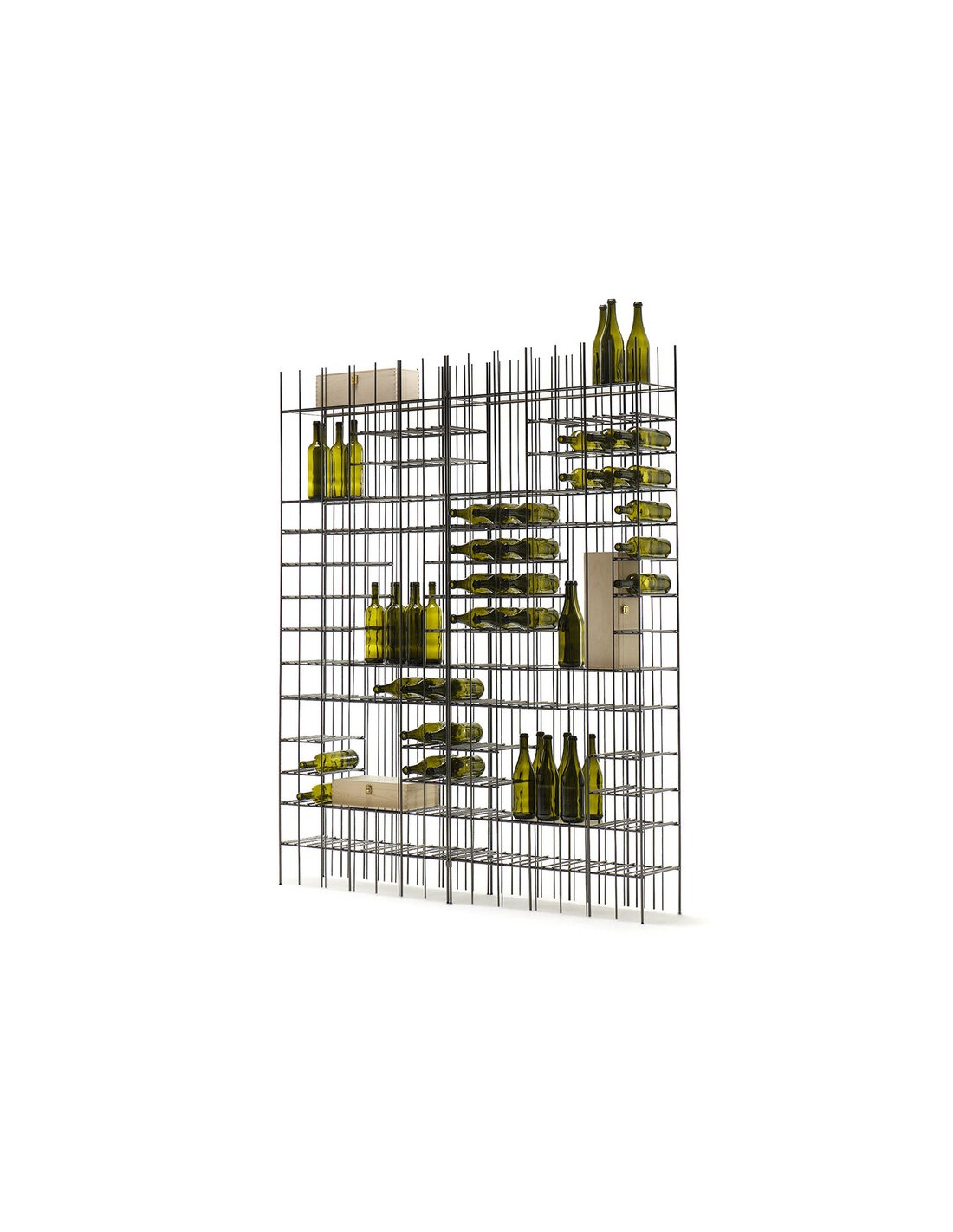 Metrica Wine è un portabottiglie caratterizzato da una semplice struttura in metallo brunito il cui ritmo è scandito dalle bacchette di ferro entro i quali, le bottiglie e gli oggetti, ne completano la forma scrivendo di volta in volta nuove composizioni. Il kit di 3 ripiani in vetro (che deve essere ordinato insieme al porta bottiglie), è disponibile in verde o bronzo. Richiede il fissaggio a parete e il kit ferramenta è incluso: 4 piedini regolabili, 2 ganci di fissaggio di sicurezza a parete, 2 giunti di unione e griglie porta.